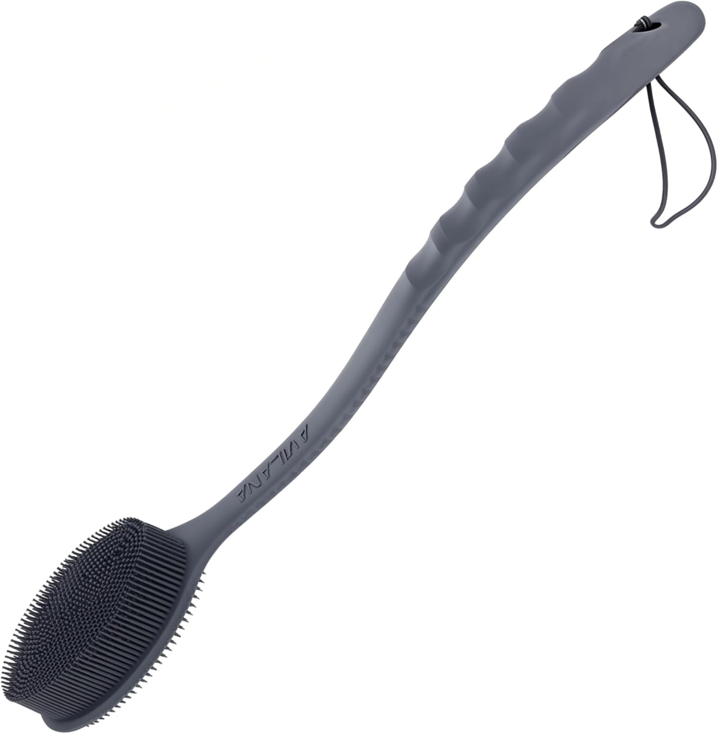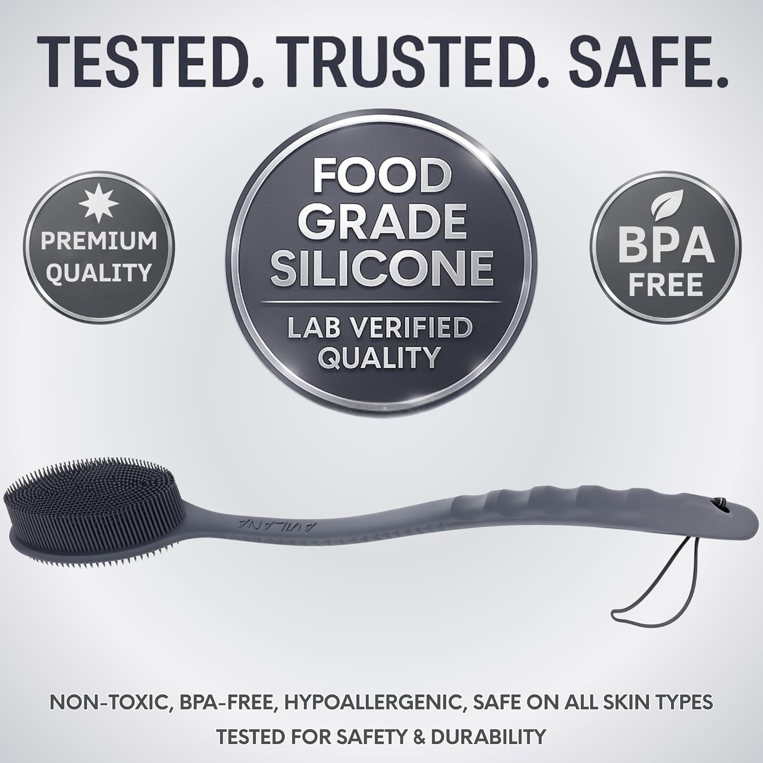 Avilana Silicone Body Scrubber – Gentle Shower Brush & Loofah Alternative- Food Grade & Lab Tested – Fast-Drying, Hygienic, BPA-Free Silicone Body Gentle Exfoliator (Dark Gray, Long Handle)