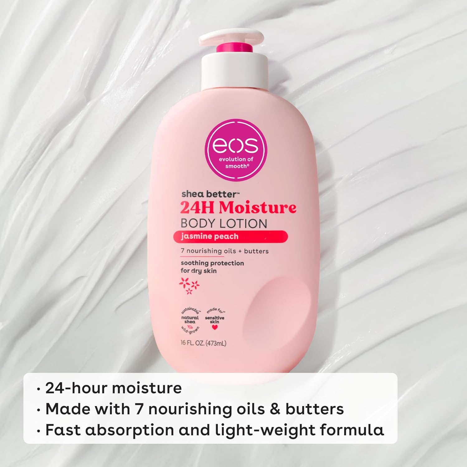 eos Shea Better Body Lotion Jasmine Peach, 24-Hour Moisture Skin Care, Lightweight & Non-Greasy, Natural Shea, Vegan, 16 fl oz