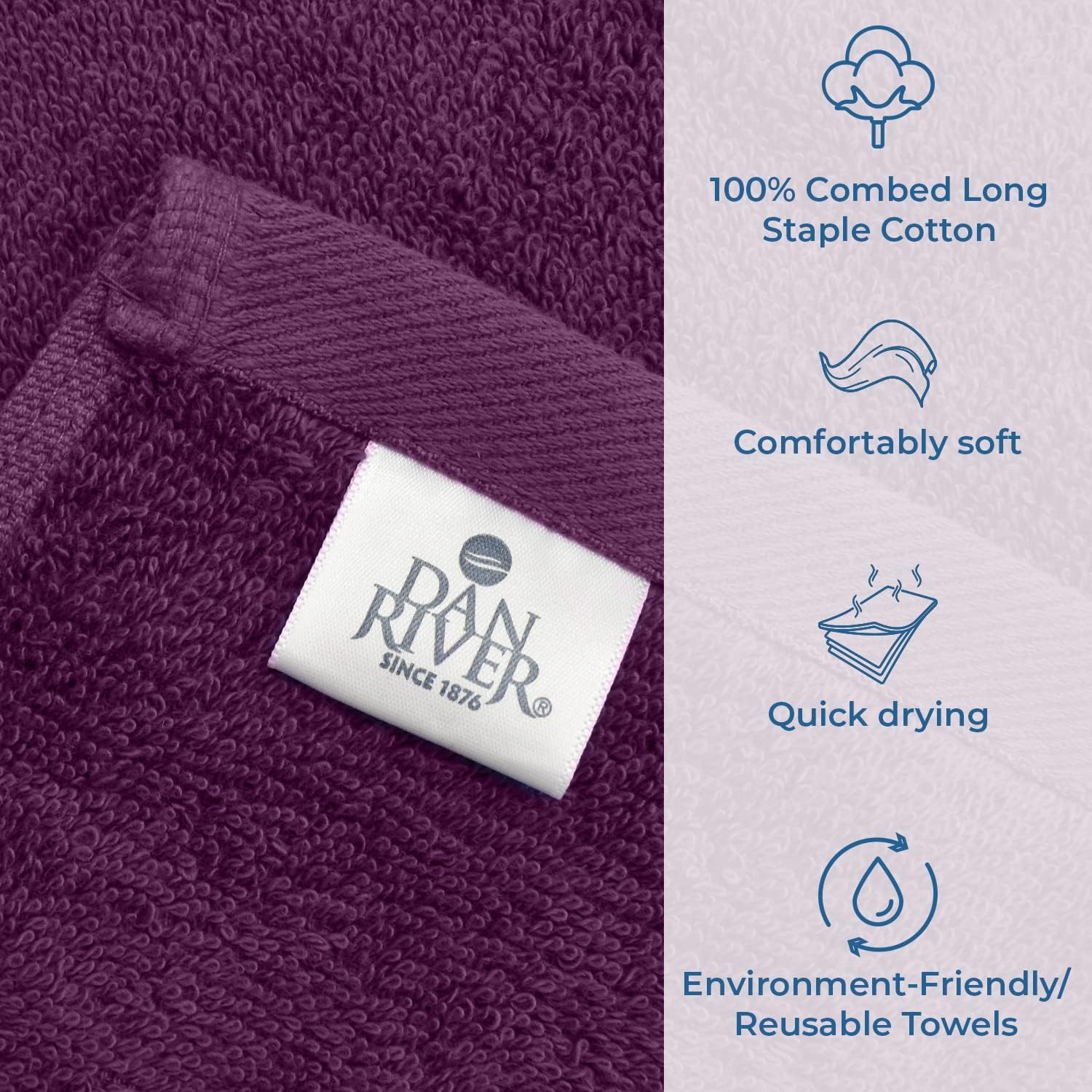 DAN RIVER Bath Towels Set of 4, 27 x 54 Inches, 100% Cotton, Larger & Lighter Weight, Quicker to Dry, Super Soft and Absorbent, Ideal Quick Dry Bath Towel for Daily Use, Purple