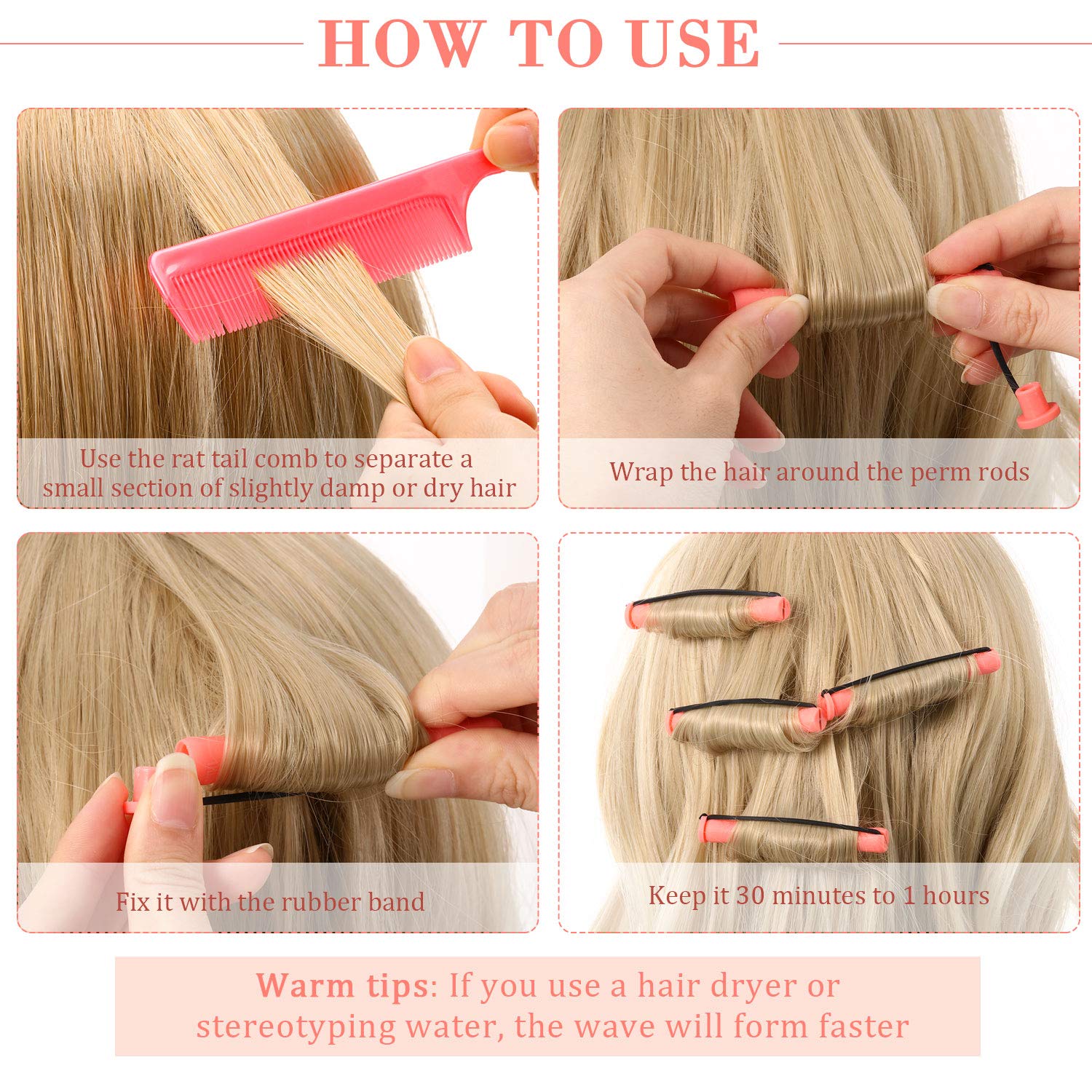 - Simple to apply: just use the rat tail comb to separate a small handful of slightly damp or dry hair, and wrap it on the rods; Then use the rubber band to fix it, does not require heating, no harm to the hair; Just wait for a while, you can make a natural curling hairstyle, adjust the direction of starting roll hair in or out can create various hair wave