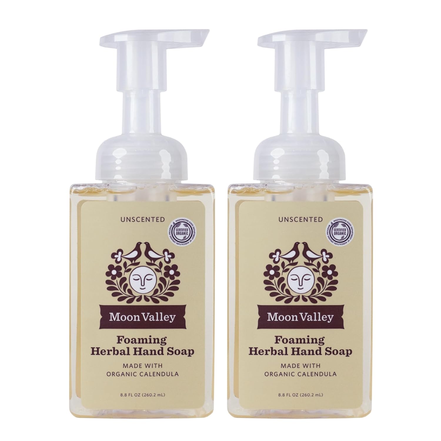 - TWO-PACK: This bundle includes two 8.8oz Unscented Foaming Hand Soaps. Moon Valley Herbal Foaming Hand Soaps are certified organic, vegan and non-gmo. Each bottle is recyclable. Ingredients leave hands soft and moisturized