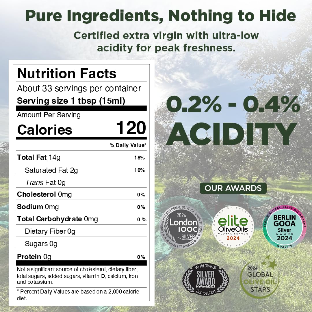 - REAL OLIVE OIL > Ingredients: 100% Greek Extra Virgin Olive Oil certified as a single origin - Centenary Orchards located in the region of Messenias, Greece (Southwestern Greece) - Natural Juice - Koroneiki Variety - Very low acidity of 0.2 -0.3% (more than three times lower than the maximum limit (0.8%) of the Extra Virgin Olive Oil category) The lower the acidity means its fresher, healthier and more natural.