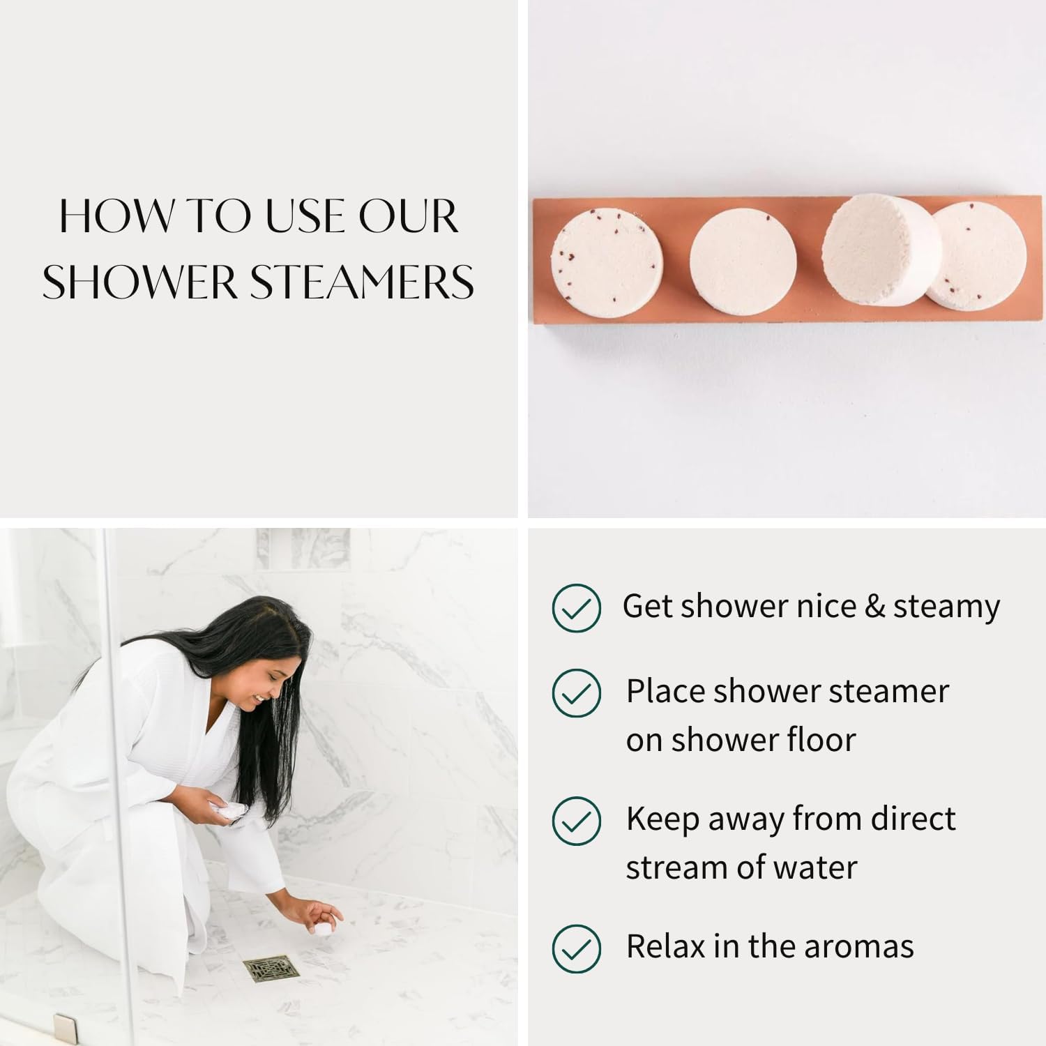 - USAGE TIPS: Simply place this shower steamers for women in the corner of the shower, or shower ledge where small amounts of water can touch the steamer. Wait for the relaxing fragrance to fill the atmosphere. Keep out of direct stream to ensure tablet lasts longer. Each shower steamer tablet lasts approximately 2 showers. High concentration of essential oils are contained in this product and is not recommended for skin use. For shower use only.