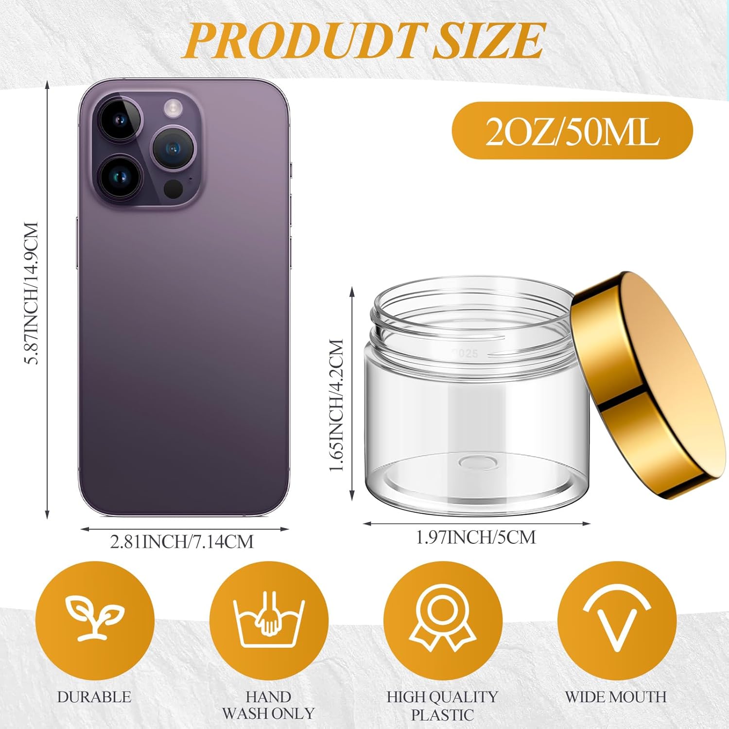 - Portable travel mini container: this mini plastic jar is 5.2 cm/ 2.05 inch in diameter, 4.3 cm/ 1.7 inch in height (lids included), with capacity of 2 oz, a set of 36 packs, convenient for carrying your skincare products, round sample jars with gold lid can be divided to hold your cosmetics, such as eye shadow, lotion, cream, or foundation