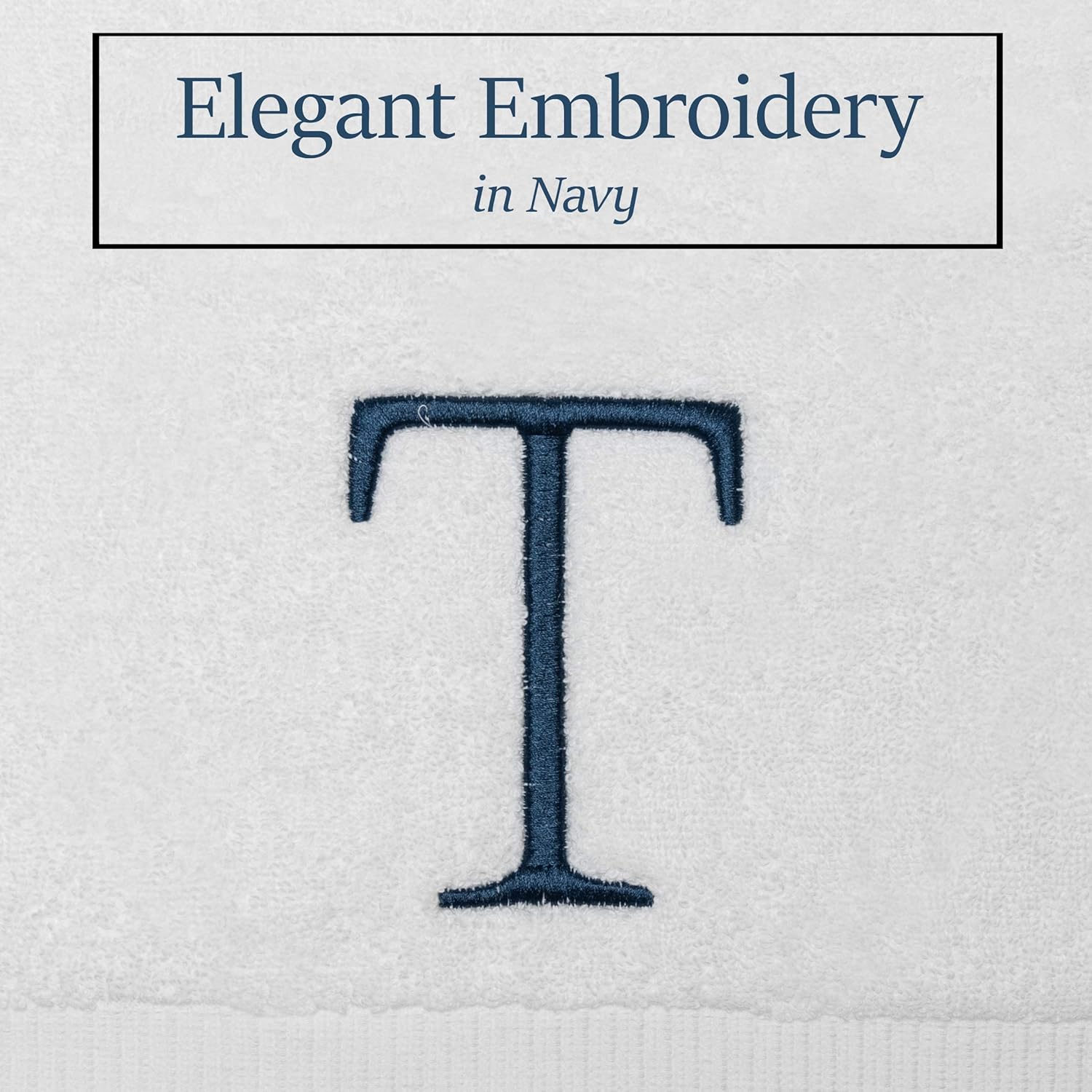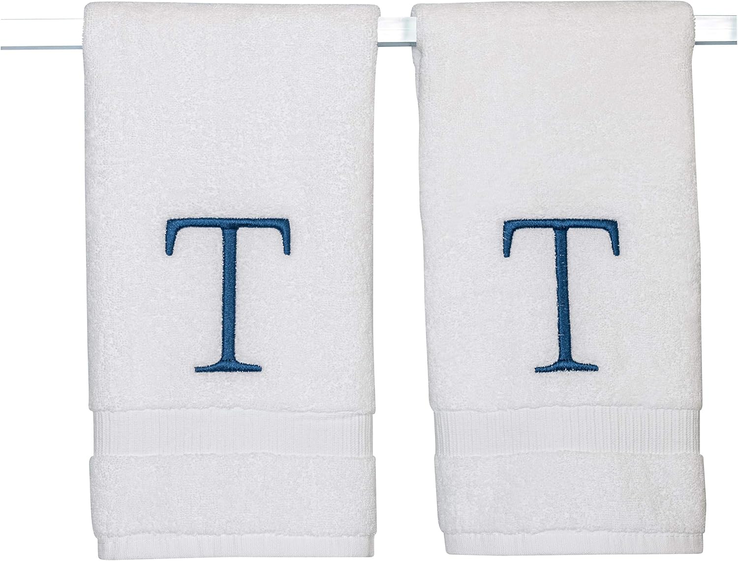Monogrammed Hand Towels for Bathroom - Luxury Hotel Quality Personalized Initial Decorative Embroidered Bath Towel for Powder Room, Spa - GOTS Organic Certified - Set of 2 Navy Letter T