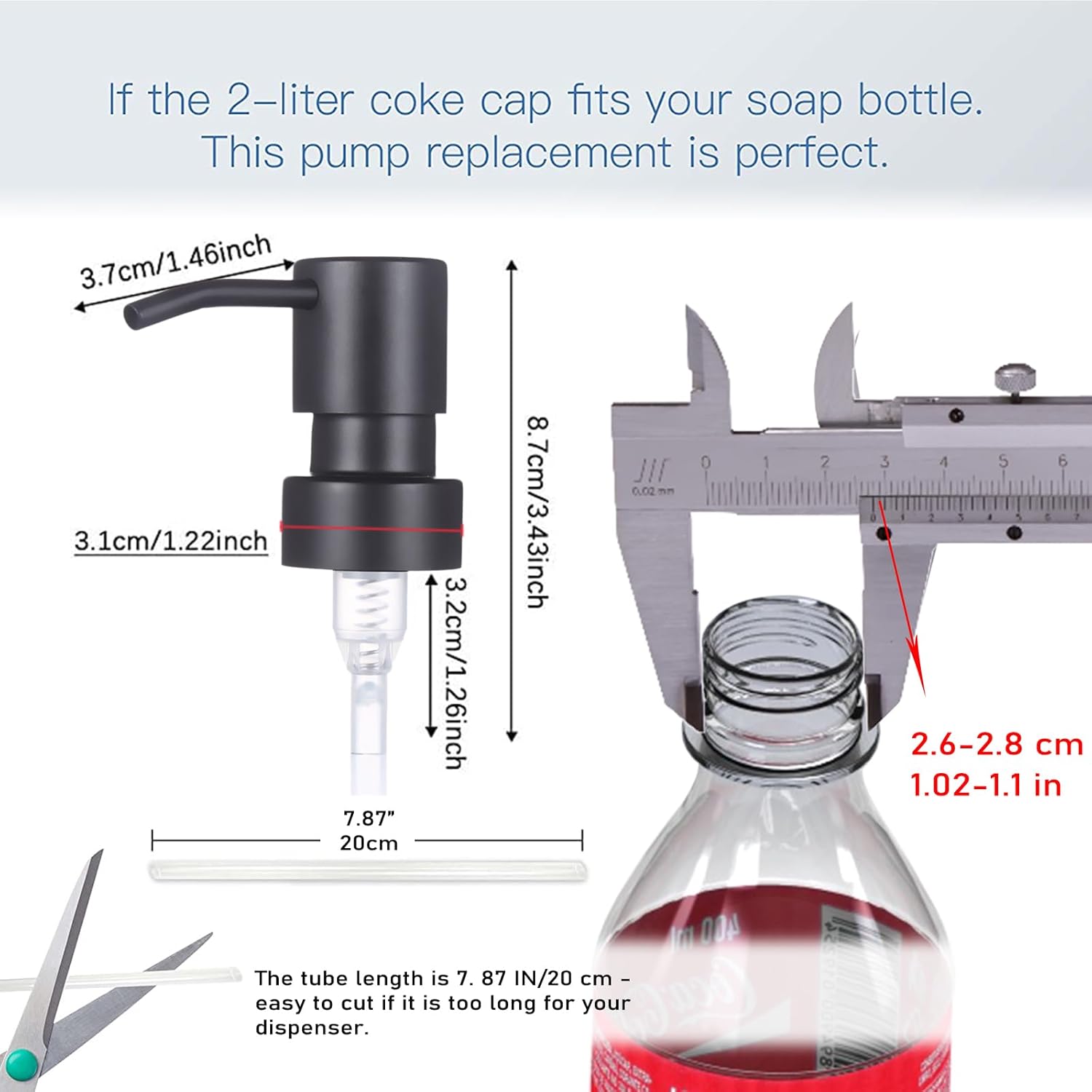 - 【STANDARD SIZE】: Suitable for bottle thread size of 1.02 IN-1.10 IN (26 - 28 mm) - Standard 28/400. The tube length is 8.66 IN/22 cm - easy to cut if it is too long for your dispenser. Fits most liquid pumps. Test your lotion or soap bottle using a cap from a 2 litre (67.6 oz) coke bottle. If it fits, this pump will work perfectly.