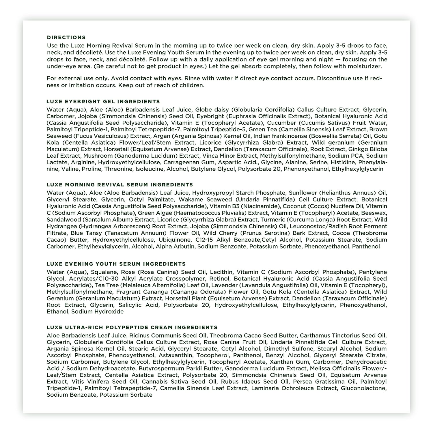 - Your total skin transformation awaits. The Luxe Eyebright Gel targets dark circles, puffiness, and crow’s feet. Luxe Morning Revival Serum awakens skin with brightening and smoothing properties. Luxe Evening Youth Serum helps combat fine lines and deeply hydrate the skin. Luxe Ultra-Rich Polypeptide Cream penetrates deep to plump and nourish.