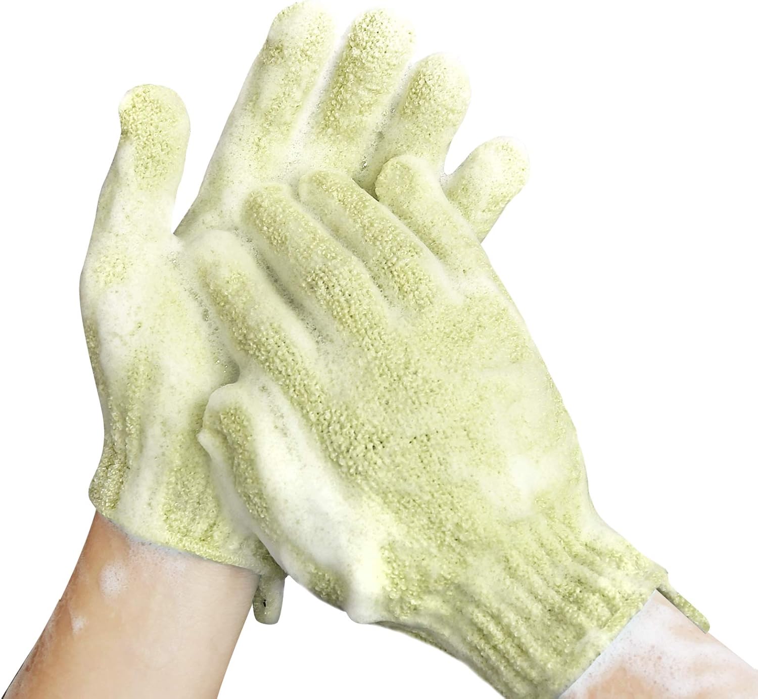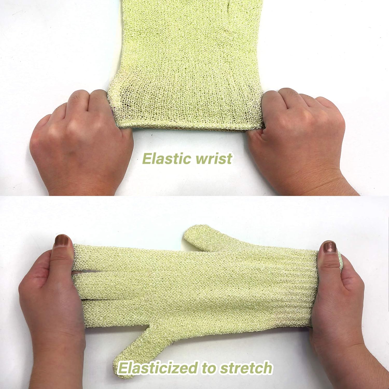 - Lengthen large size : Our exfoliating shower gloves is improved extended version which is a bit larger than most of the sizes on the market. Textured mitts are elasticized to stretch, two size suitable for both women and men. The elastic wrist provides a perfect fit and keeps the shower gloves stay in place.