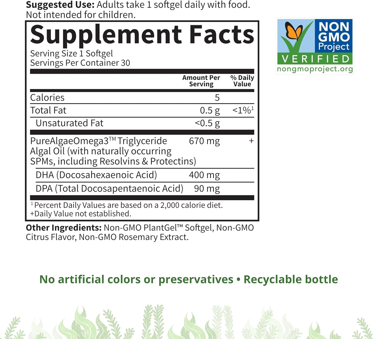 - OMEGA VEGAN SUPPLEMENT WITH DHA FOR BRAIN AND HEART: Delivers over 400 mg total Omega-3s with naturally occurring Specialized Pro-Resolving Mediators (SPM)—compounds that support the body's normal inflammatory responses—including Resolvins and Protectins