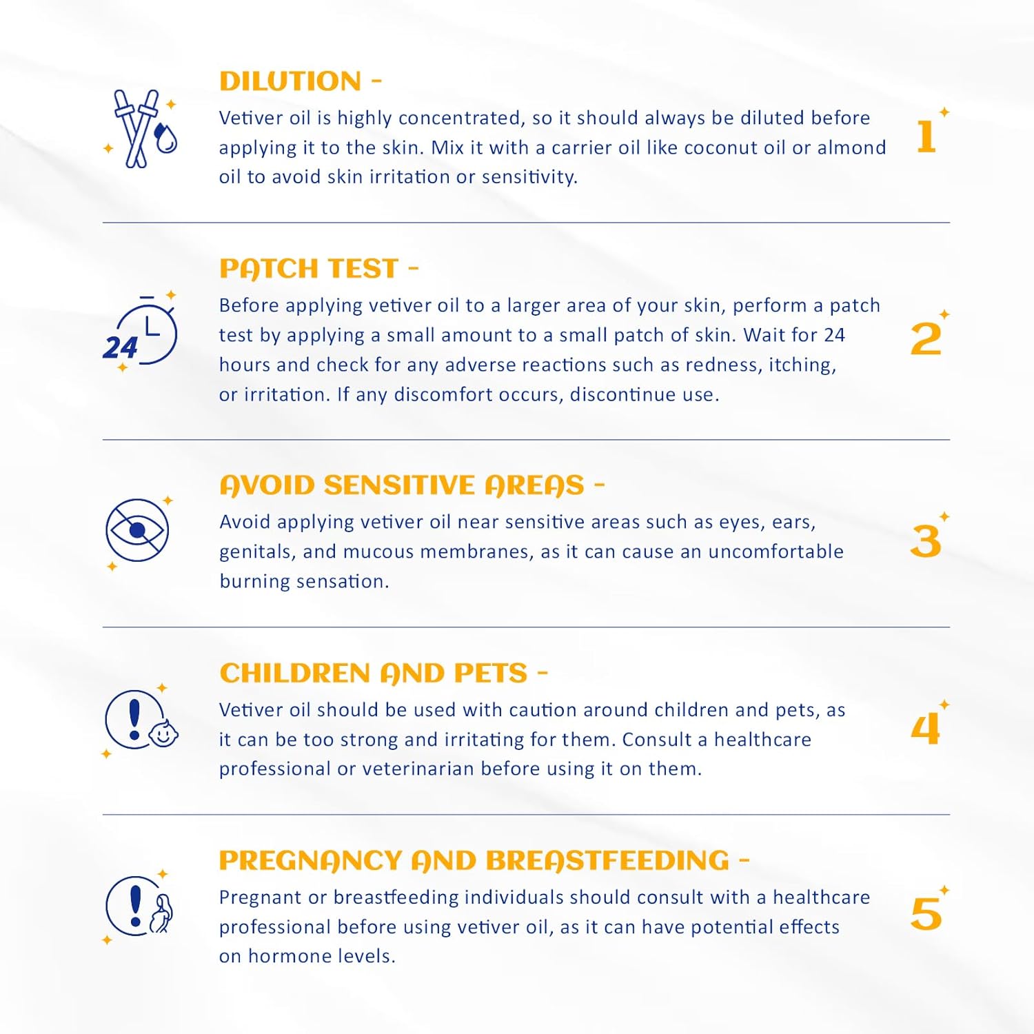- Multiple Blend: The woodsy scent of vetiver essential blends well with Clary Sage, Lavender, Rose, Sandalwood, and Ylang Ylang. Dilute with carrier oil before use. Test on feet first for skin sensitivity prior to widespread use
