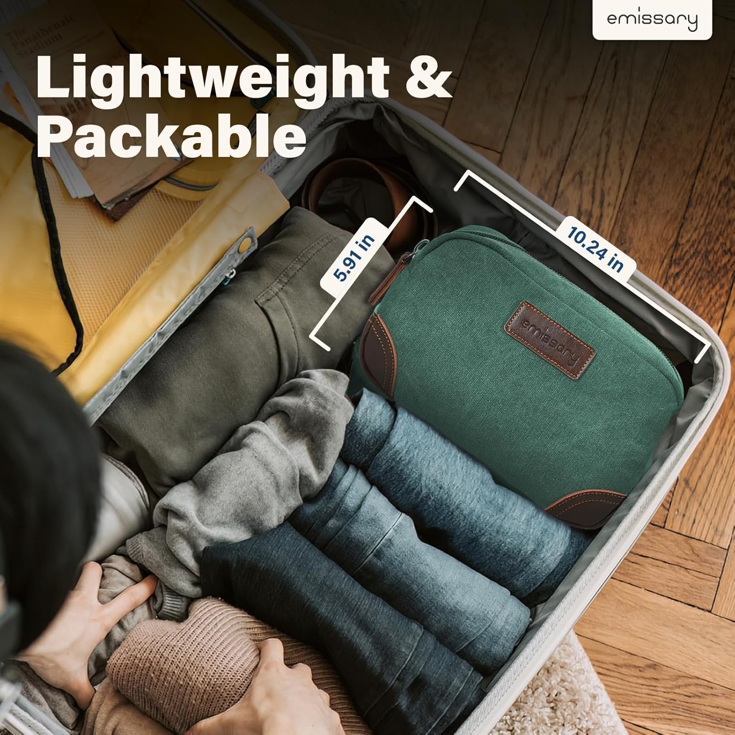 - HIGH-QUALITY DURABLE MATERIAL: This exceptional toiletry travel bag by emissary is made of canvas and PU leather, which is known for its lightweight yet durable qualities, the perfect combination for traveling. This specific material is water resistant, making it safe for use in environments where it may become wet. Making this the perfect bathroom bag, shaving bag, and travel dopp kit.
