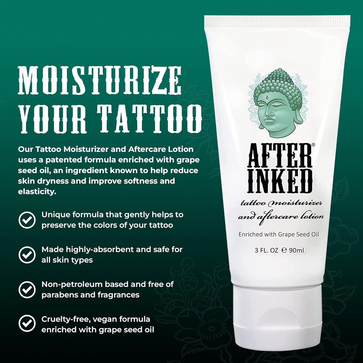 - VEGAN: After Inked tattoo aftercare foam cleanser and tattoo aftercare lotion are blended and packaged in the USA using global ingredients sulfate-free, cruelty-free, fragrance-free, and paraben-free. They were formulated to fit every lifestyle and skin type. With a patented formulation, our aftercare lotion hydrates the skin and reduces Trans Epidermal Water Loss (TEWL).