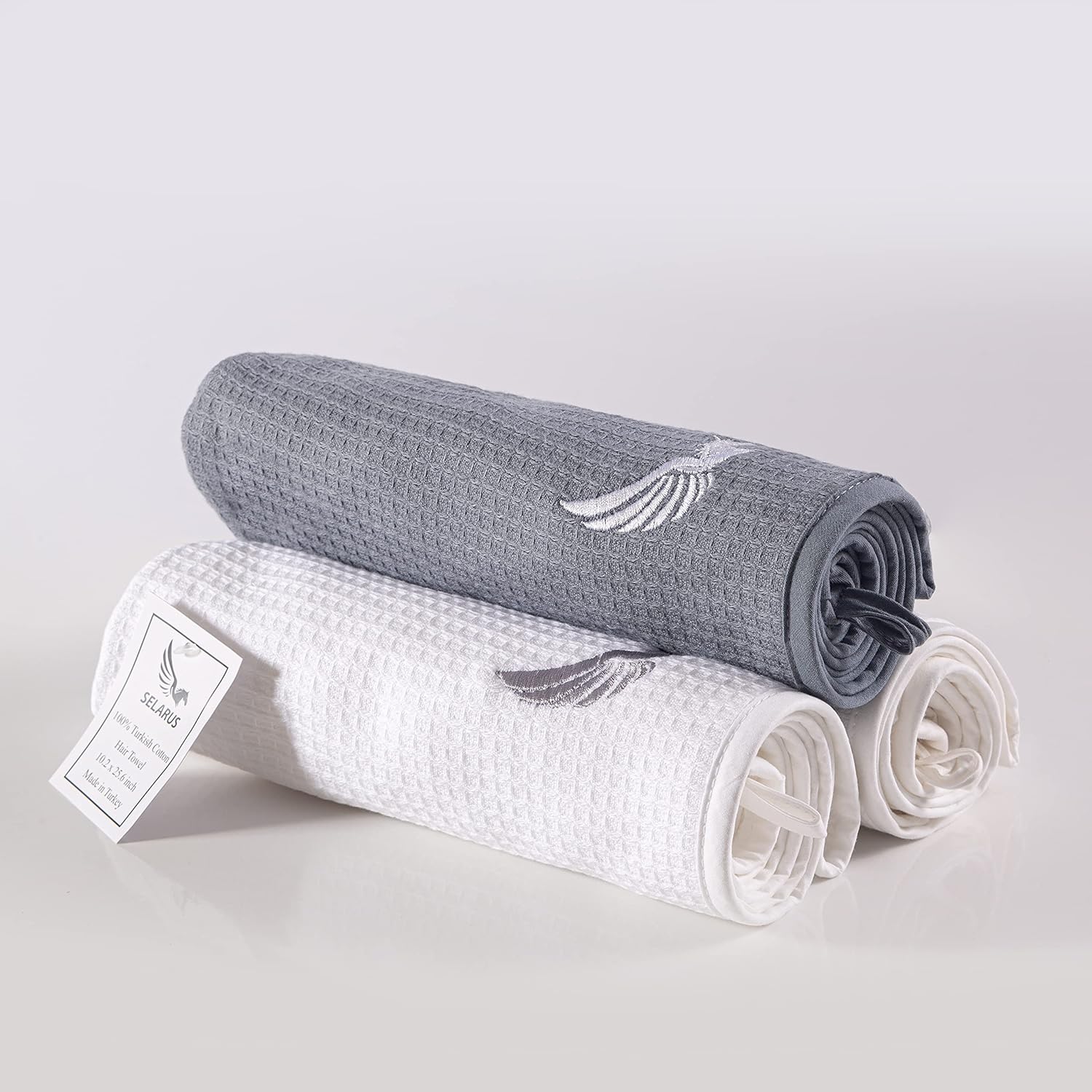 - BEST FOR ALL HAIR TYPES: 26x10 inches. Easy to wrap and use.You can use while doing MakeUP, work or getting dressed. Protect your hair health. Great for home, travel, workout or pool. 100% Cotton hair towel wrap for curly,wavy,long or thick hair. UNIQUE LOOP SYSTEM Selarus hair towels has banded edges and durable unique loop systems for last longer than elastic loop. Our towels are more durable,super absorbent and last longer than other towels