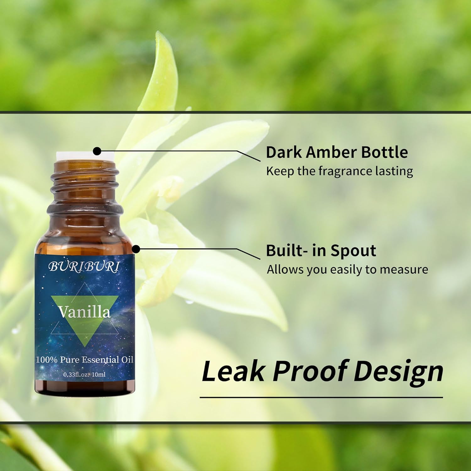 - Packing Includes: 10ml Vanilla Oil x1, 10ml Jasmine Oil x1. With no adulterants or dilution, 100% pure quality. BURIBURI scented oil is bottled in a durable amber glass bottle.