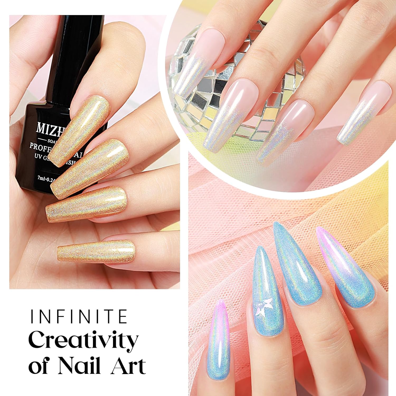 MIZHSE 8 Colors Holographic Gel Nail Polish, Laser Iridescent Gel Polish Set, Chrome Rainbow Shimmer Glitter Nail Gel, Sparkly Shiny Gel Polish Silver Pink Nail Art Salon at Home Women Gift