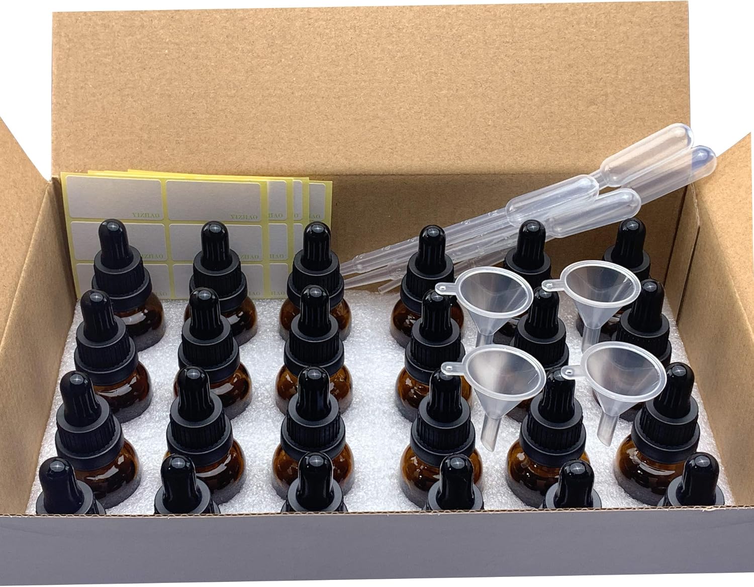 - [Package Contains] 24 clear glass eye dropper bottles + 24 mini glass dropper with Silicon Rubber tops + 4 more 3ml plastict pipettes dropper + 4 plastict mini funnel + some labels.