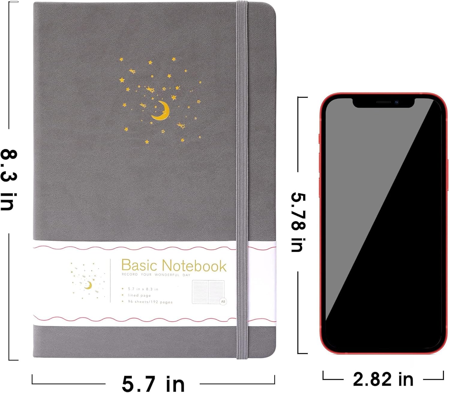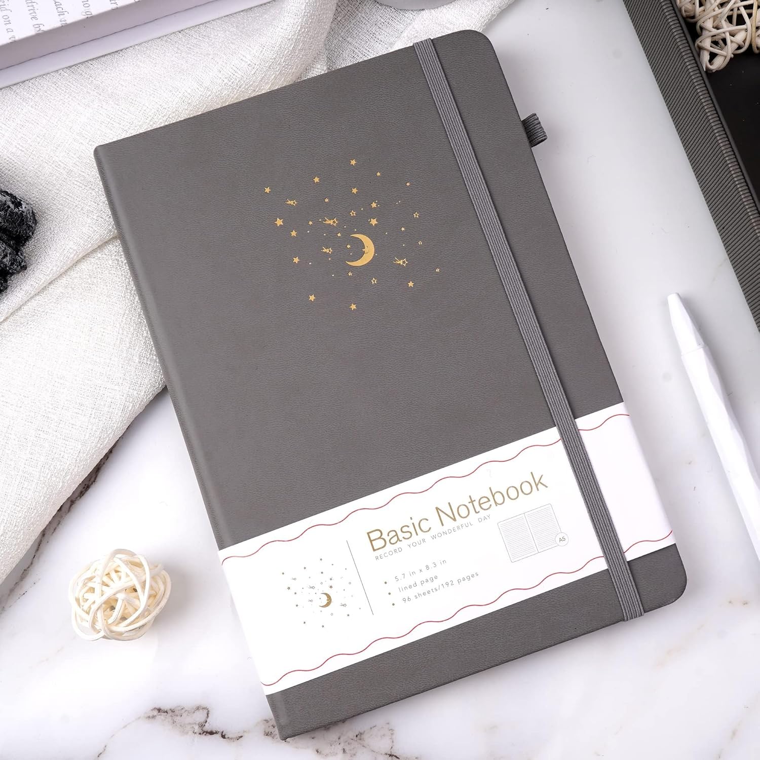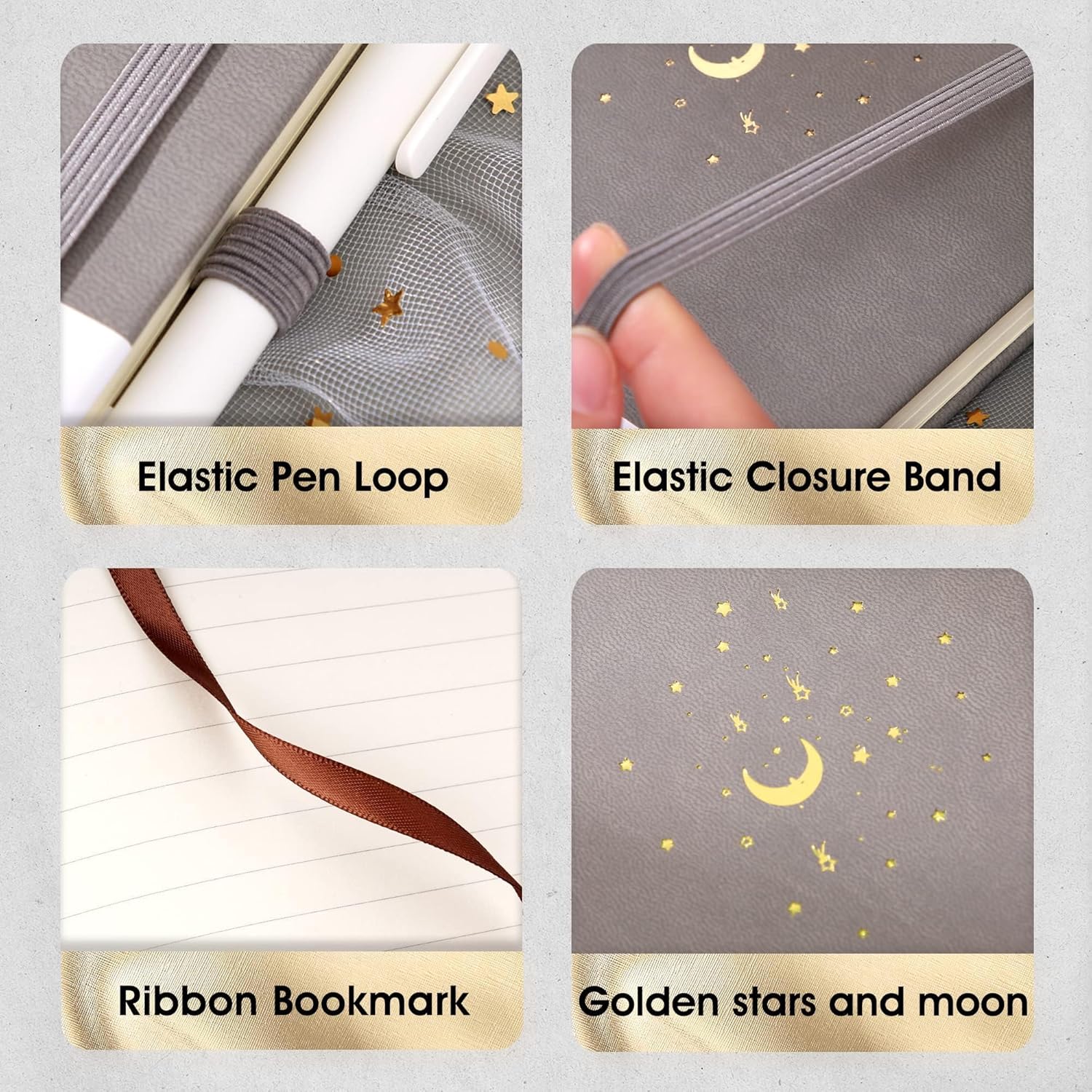 - ✒️ COVERS DESIGN - A5 notebooks for work with gorgeous gold foiling pattern - moon, stars and meteor. Exquisite lined journal is the best decoration for the desk. The journal notebook cover is made of cloth, Elastic banded, Satin ribbon bookmark, Pen loop.