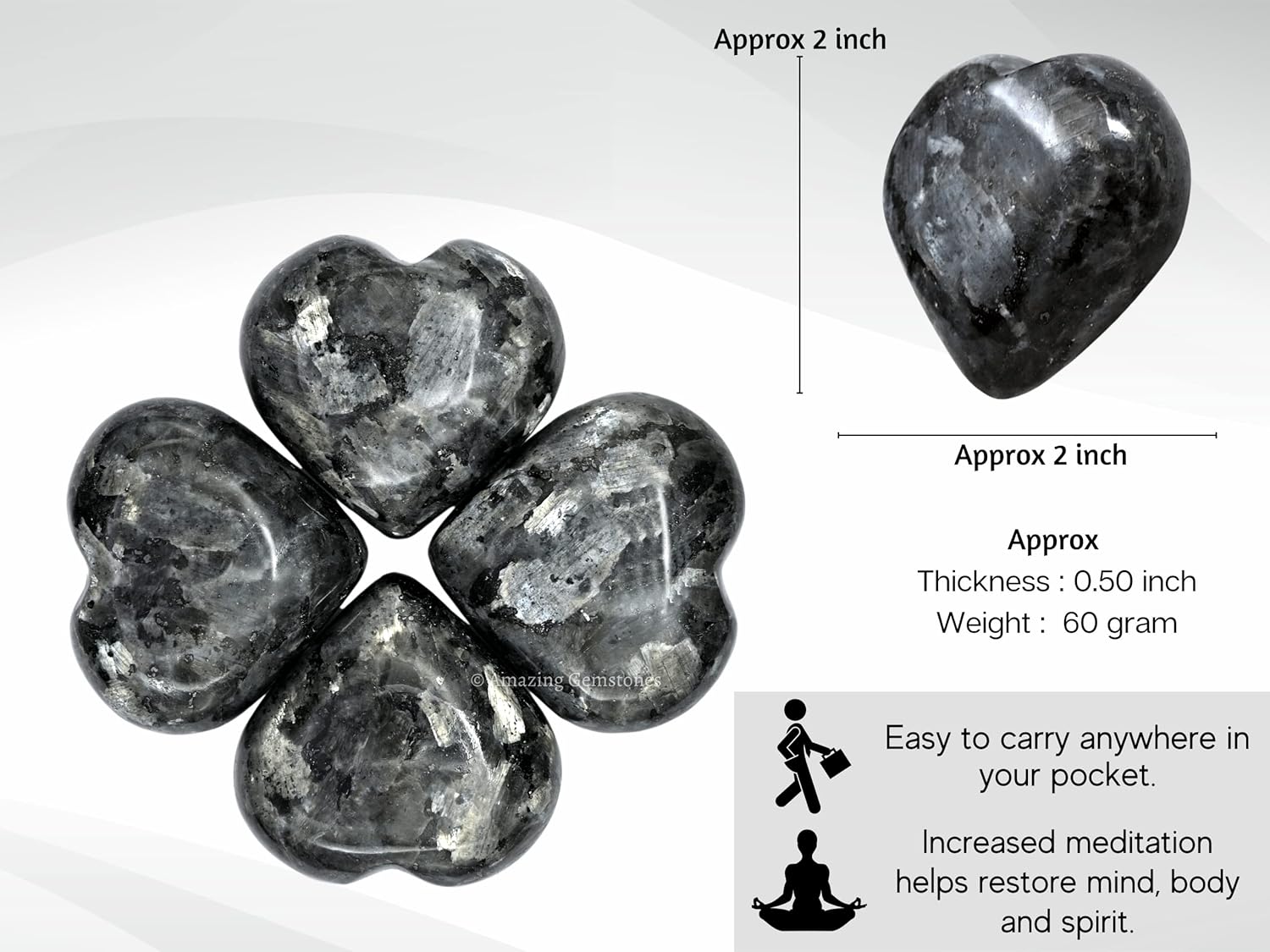 Amazing Gemstone Larvikite Crystal Heart Palm Stone - Pocket Massage Worry Stone for Natural Body Chakra Balancing, Reiki Healing and Crystal Grid