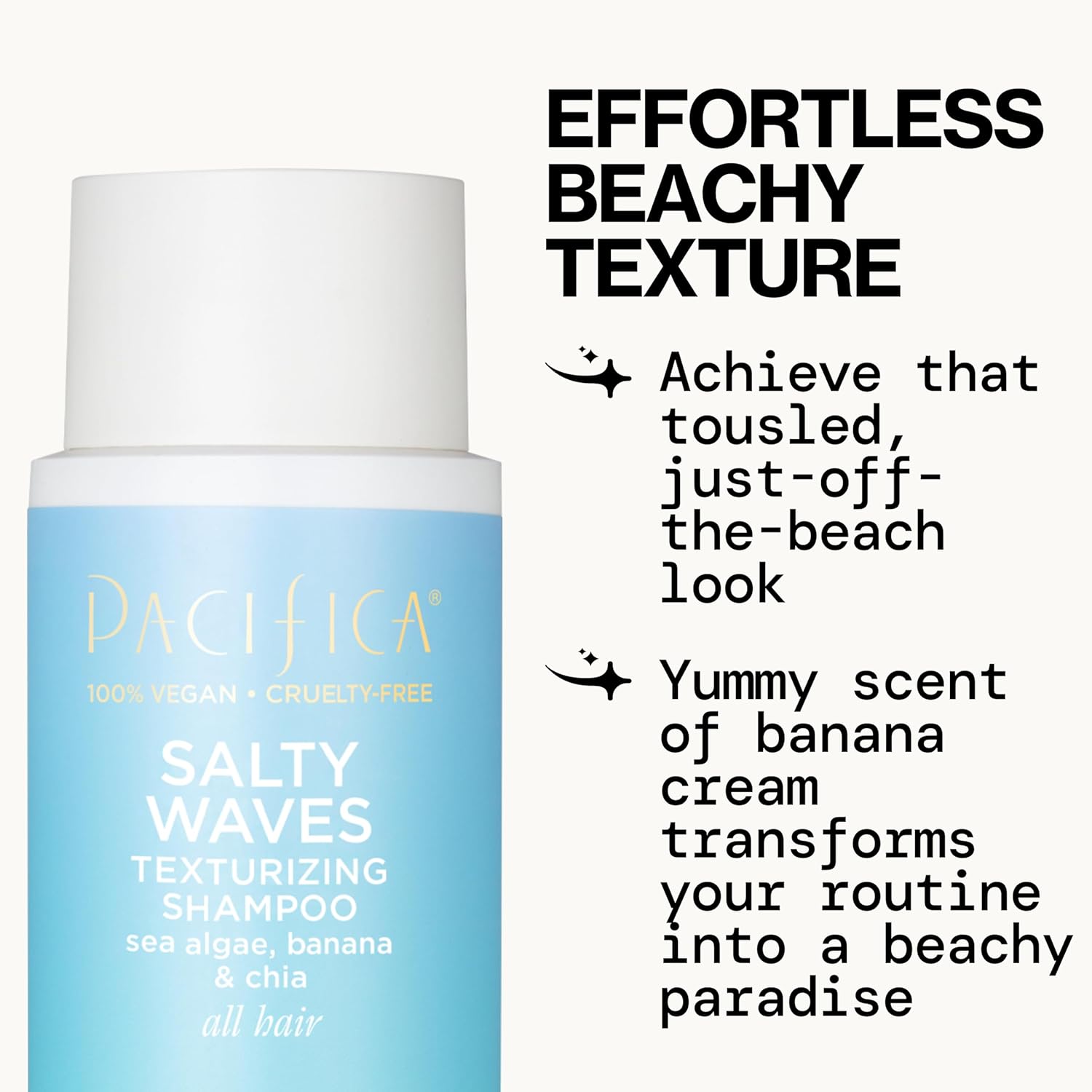 - CREATE BEACHY WAVES & TEXTURE: Get that effortlessly tousled, “just came from the beach” look with Pacifica’s Salty Waves Texturizing Shampoo and Conditioner set. Formulated with natural sea plant extracts and a touch of sea salt, this duo adds light grit and body to hair, helping coax out waves and texture even in straight or fine hair. It’s perfect for achieving surfer-girl vibes – think soft, piecey waves with easy-going volume. No ocean required for these beachy waves!