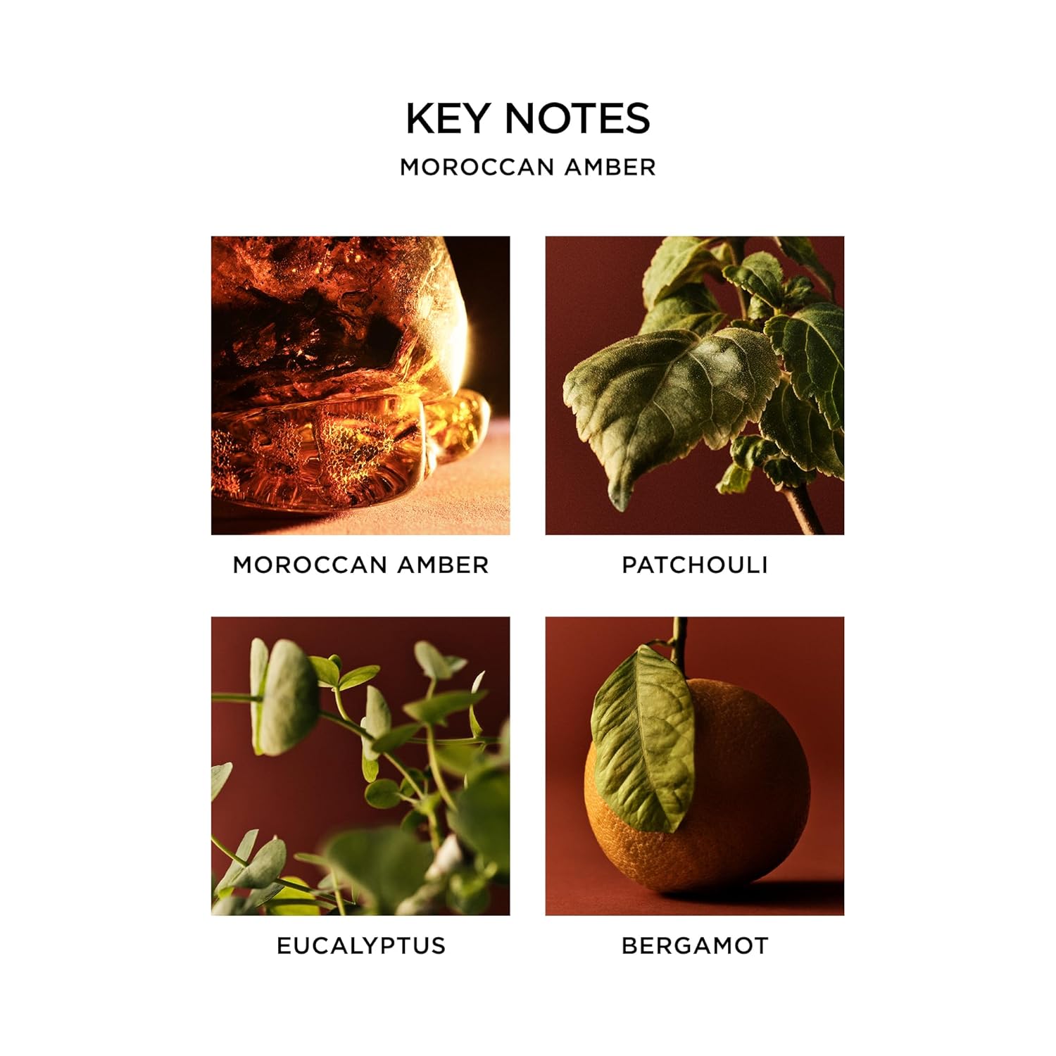 - EARTHY & WOODY - An alluring blend of Moroccan amber, sweet patchouli, heliotrope, and bergamot accented with a hint of eucalyptus that creates an exotic atmosphere.