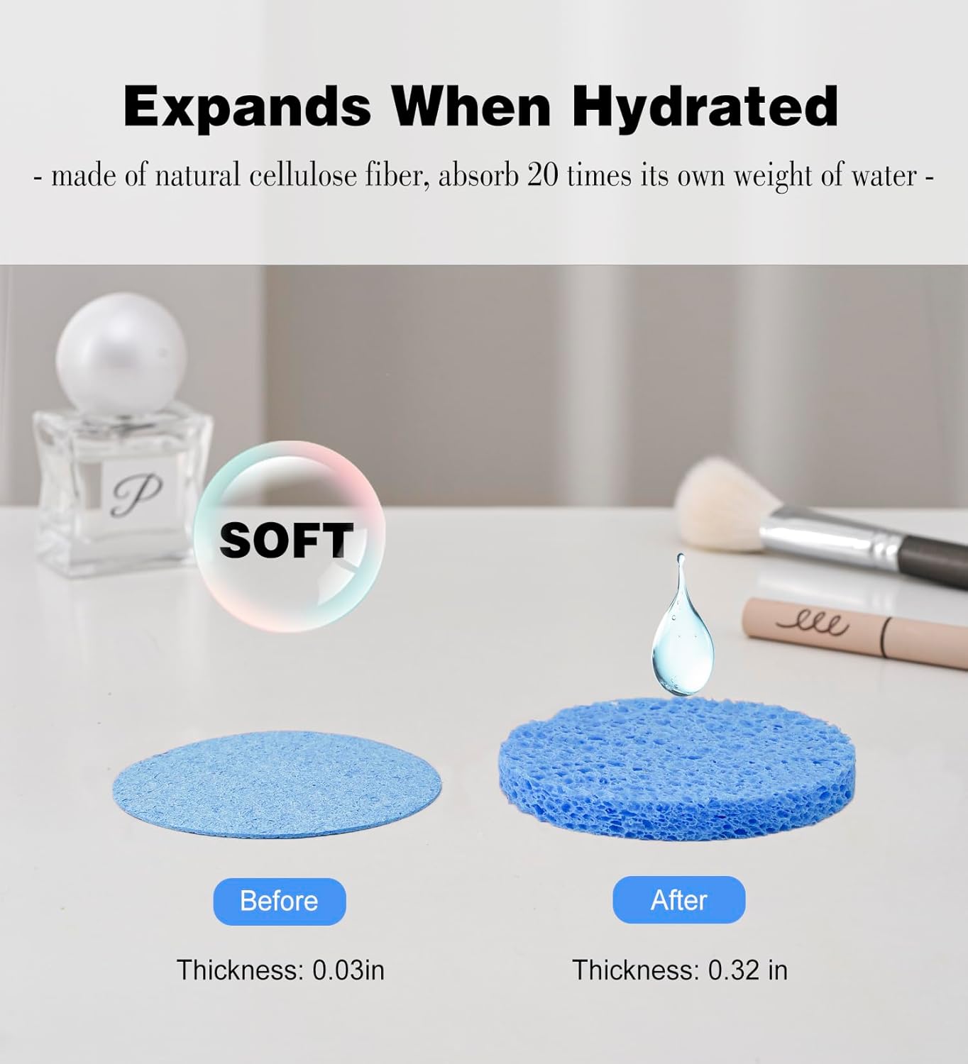 - 【Package & Size】: 50-count little round cellulose facial sponges. 2.8" dia. x 0.32" thick after hydrated