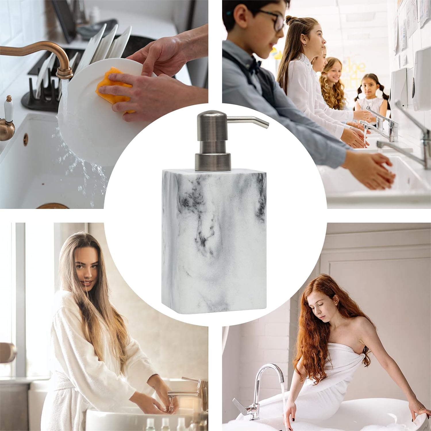 - PREMIUM MATERIAL: Soap dispenser with brushed nickel pump, made of high-quality resin and sandstone. The bottle mouth has enough threads to hold the pump stably and not leak.