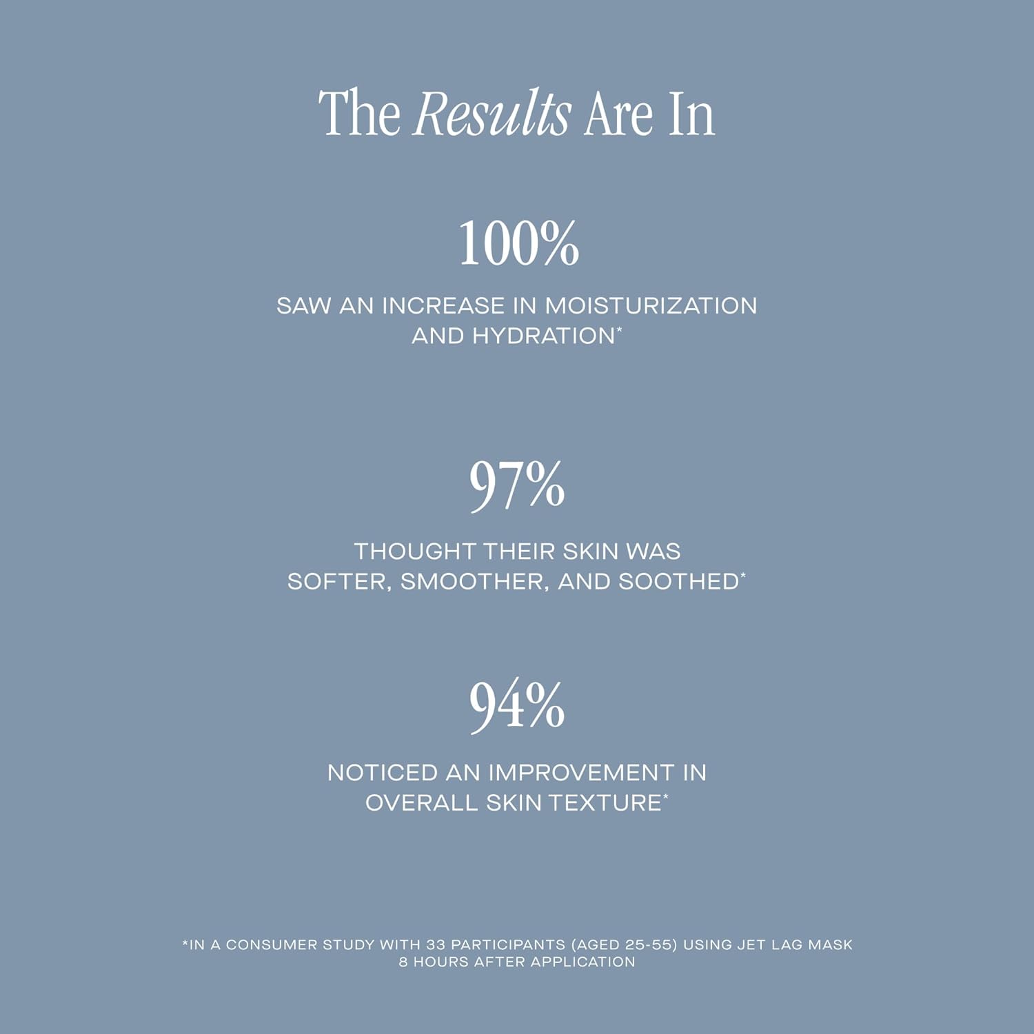 - The Results Are In - In a consumer study with 33 participants aged 25-55, 100% of participants saw an increase in moisturization and hydration 8 hours after application of Jet Lag Mask.*