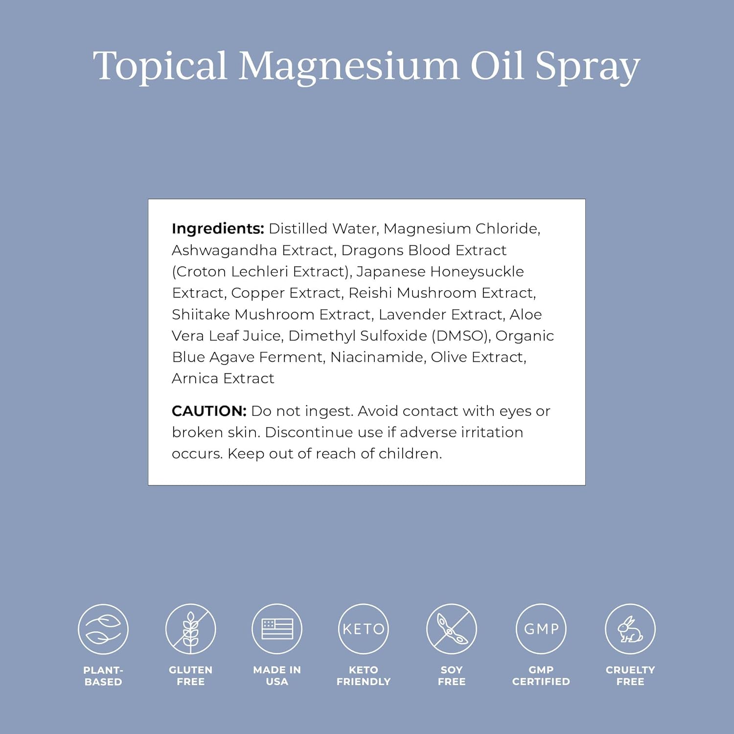 - MAGNESIUM SPRAY OIL: Our Topical Magnesium Oil can be a quick and easy way to increase magnesium levels beyond taking an oral supplement. It's scientifically formulated to absorb into the bloodstream within minutes, to help keep your skin free of oil and can provide muscle, joint, & sleep support.