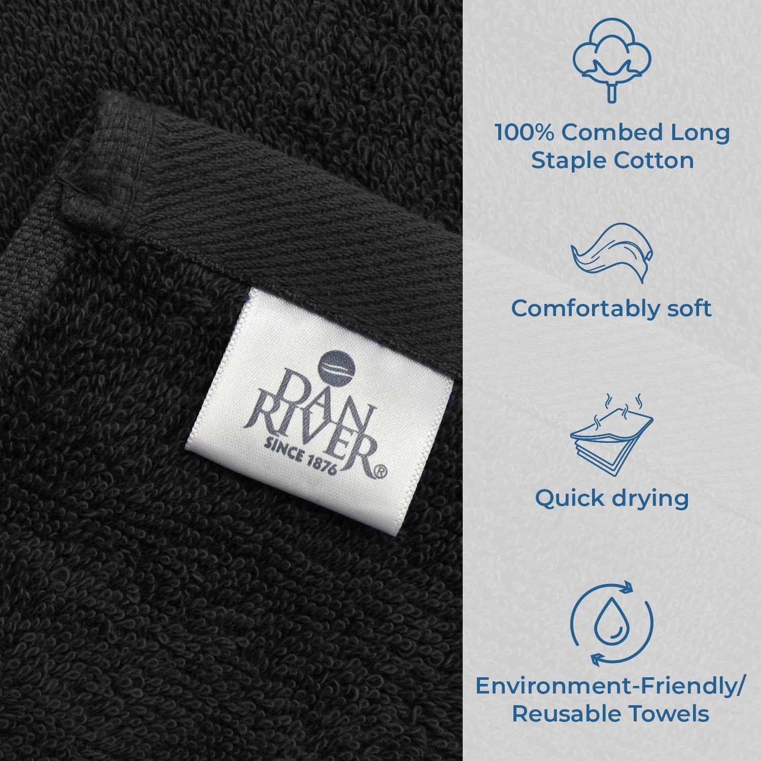 DAN RIVER Bath Towels Set of 4, 27 x 54 Inches, 100% Cotton, Larger & Lighter Weight, Quicker to Dry, Super Soft and Absorbent, Ideal Black Bath Towels for Daily Use