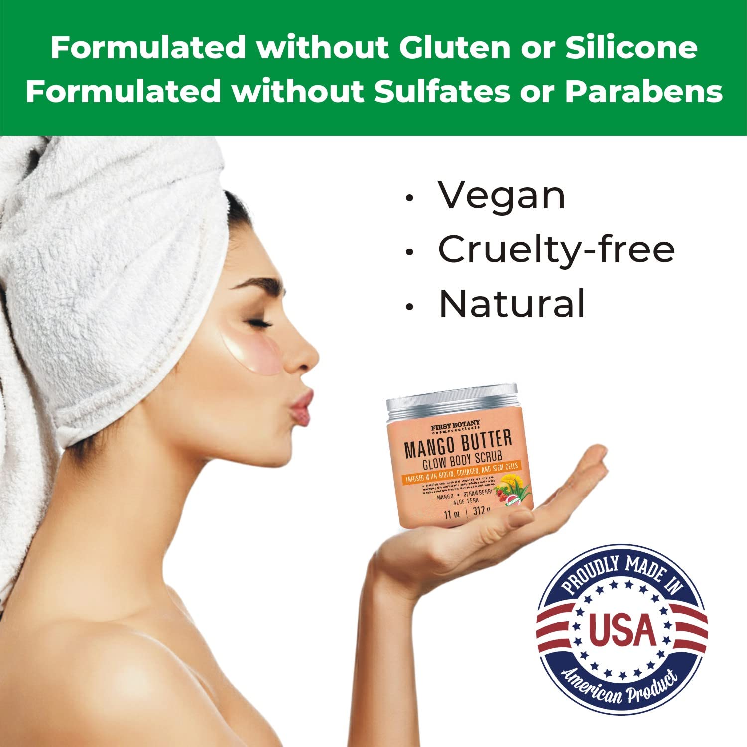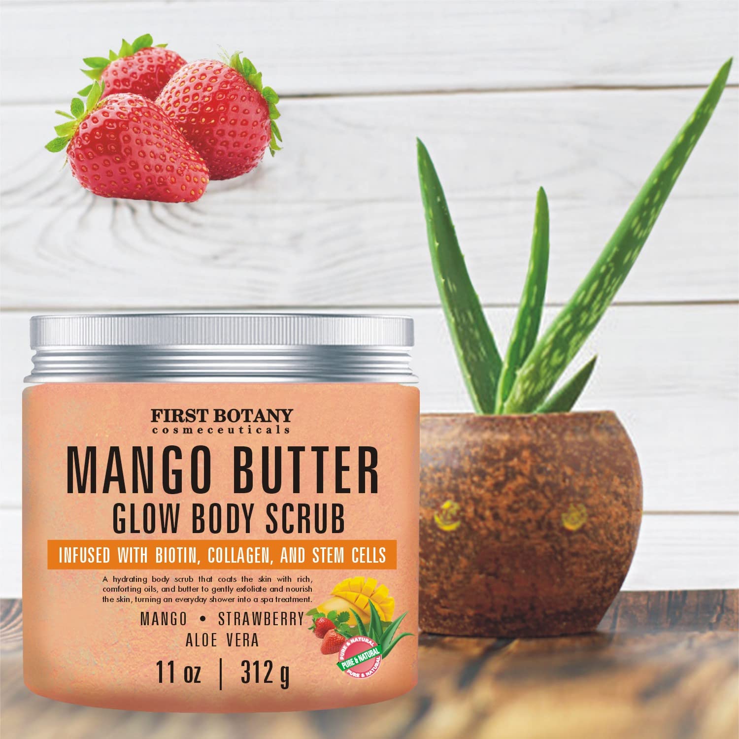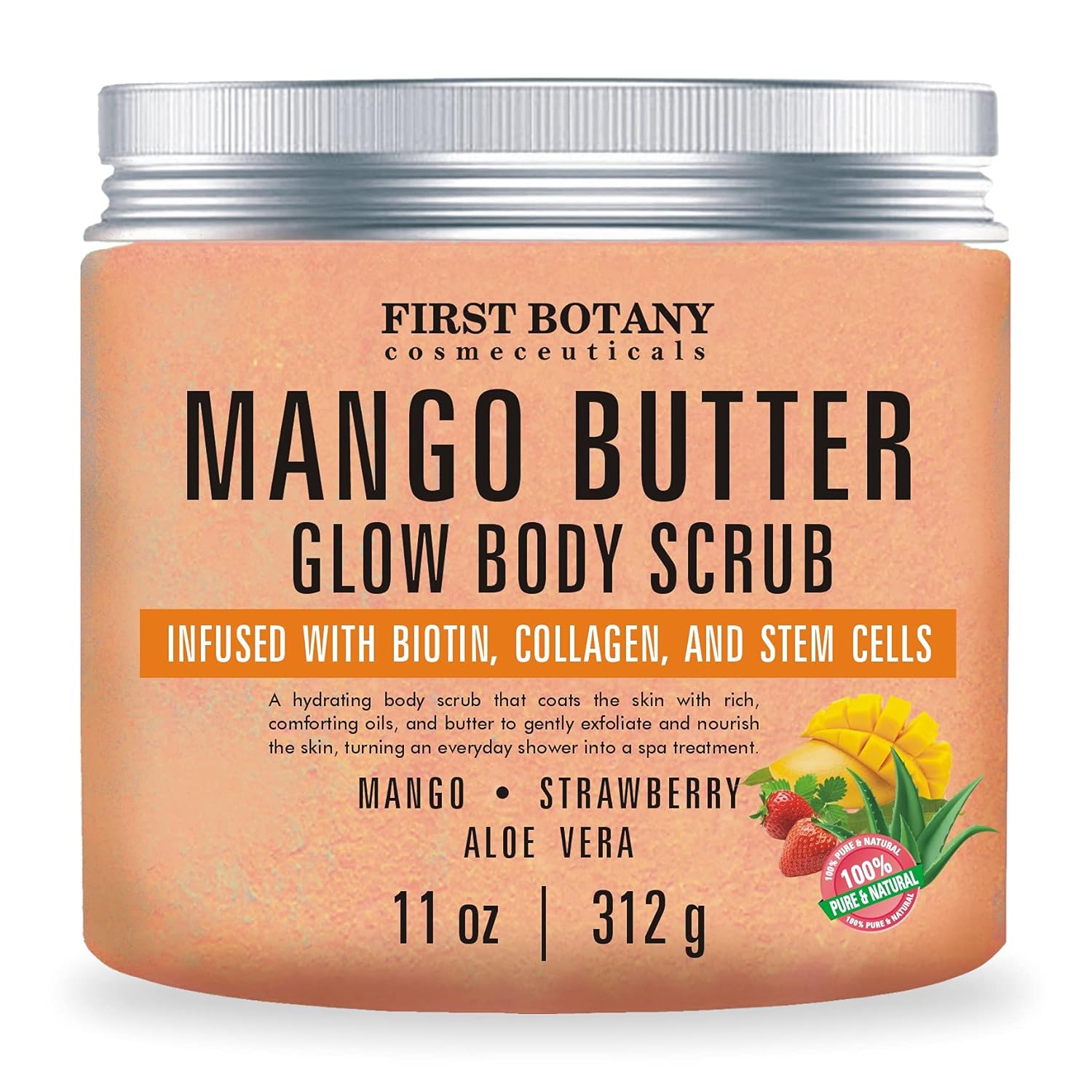 Mango Butter Body Scrub Exfoliator Biotin, Collagen, Stem Cells - Natural Exfoliating Salt Scrub & Body and Face Souffle helps with Moisturizing Skin, Acne, Cellulite, Dead Skin Scars, Wrinkles- 11 oz