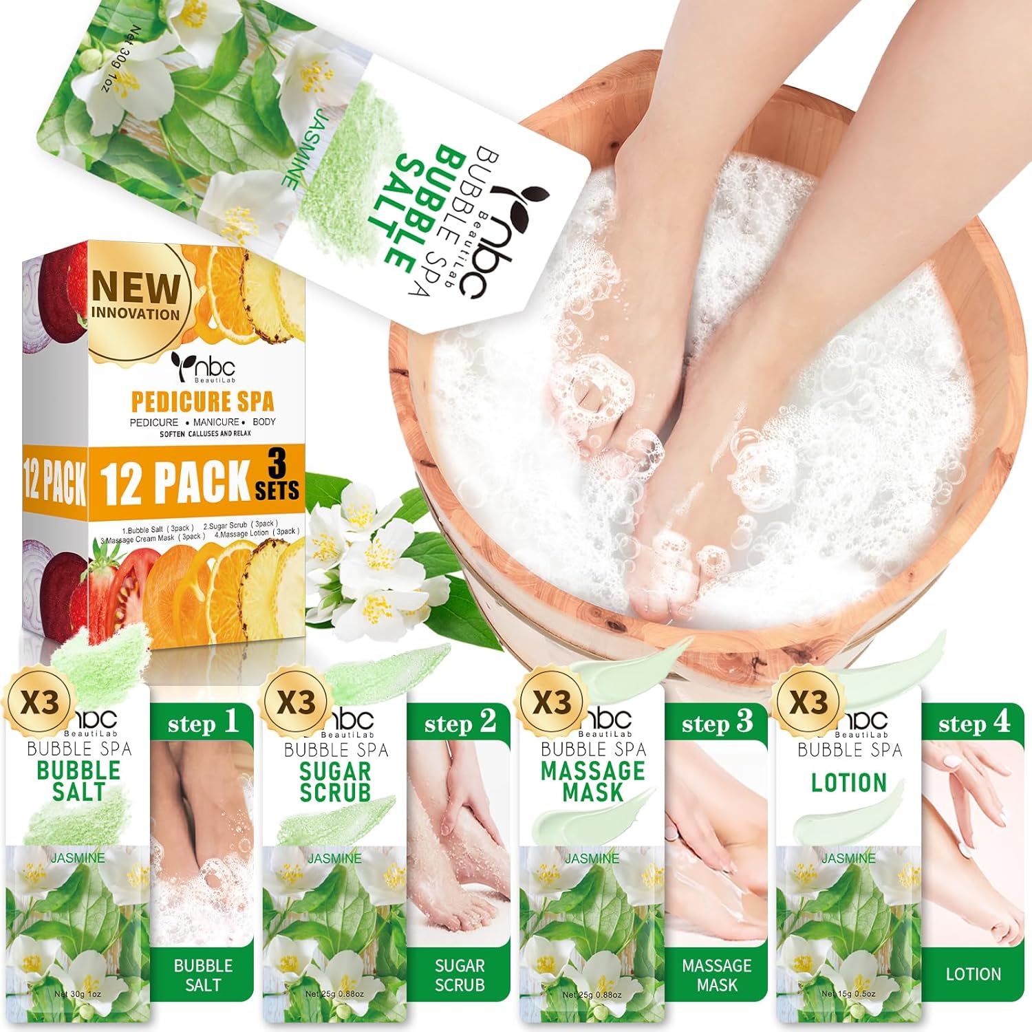 Pedicure Kit Foot Soak Set: Bubble Salt, Sugar Scrub, Massage Mask, Massage Lotion in a Box, 4 Step Foot Spa Kit for Dry Feet, Calluses and Tired Feet(3 Set Jasmine)