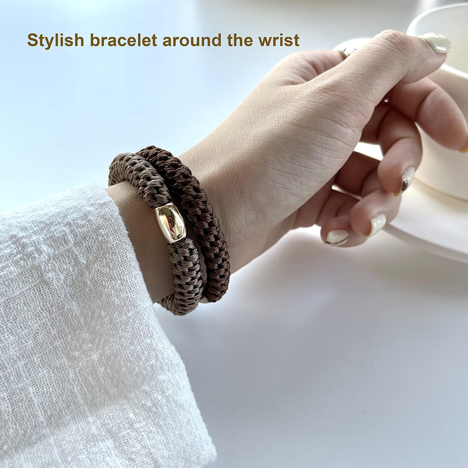 - 【Nice Material】The best hair tie for your hair:Our bracelet hair ties is made of plied yarn woven material with stylish ornamental Gold-plated bead accent,it can be seen that the strands have a high gloss, higher brightness than other materials, have a smooth feel and they are not easy to pilling.