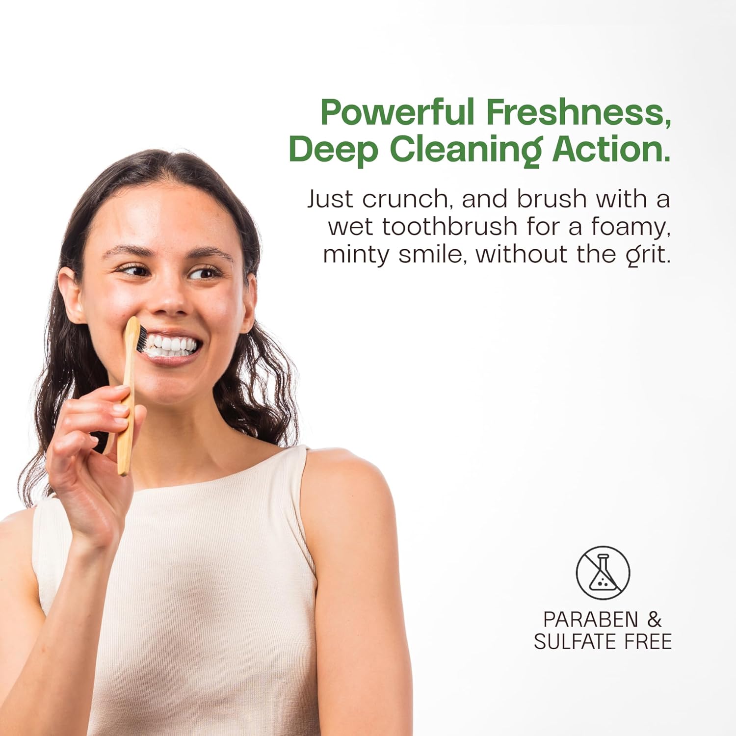 - Chewable, bite-sized tabs: No paste, no mess! Compact tablets in zero-waste, compostable packaging.