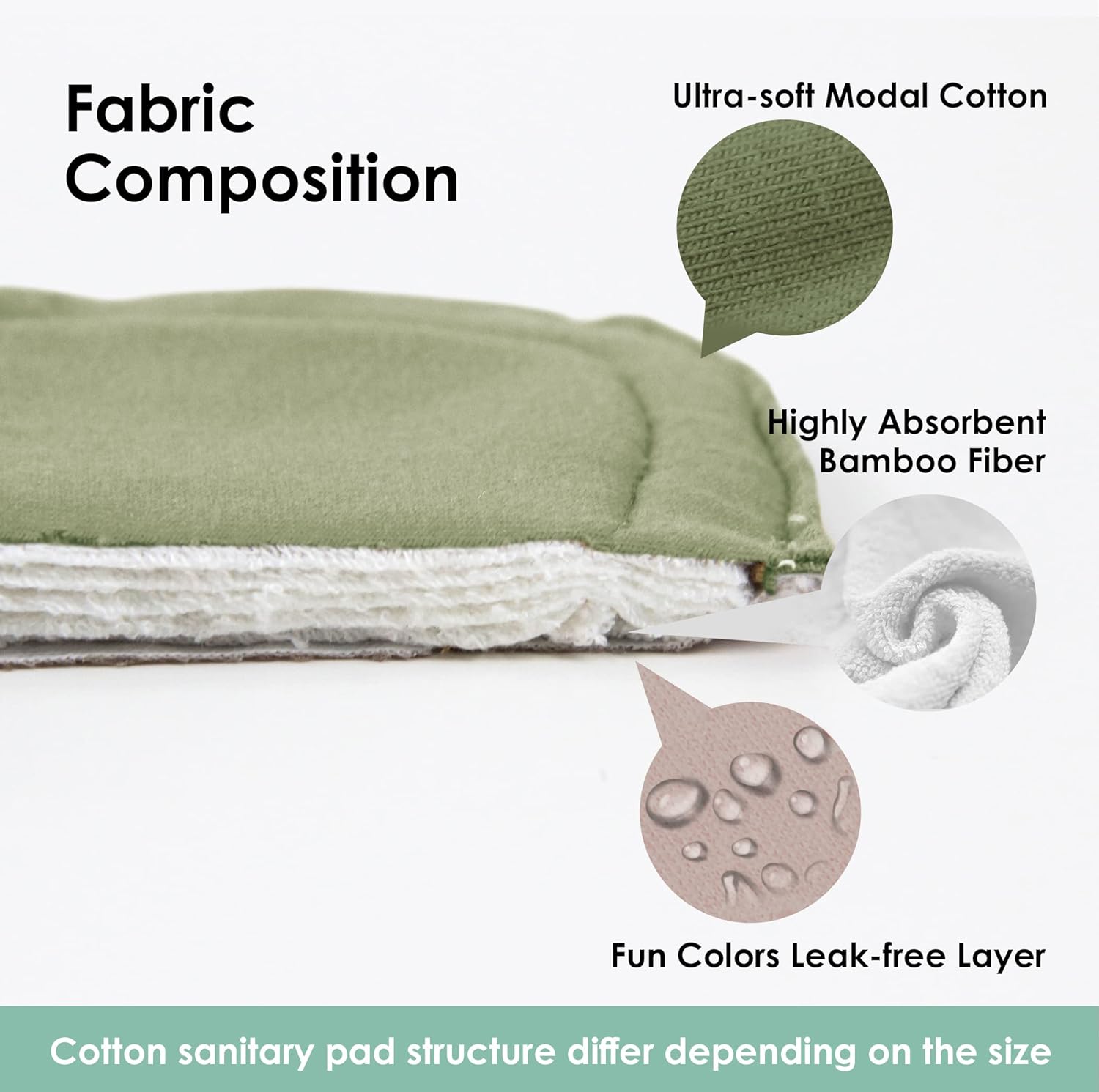 - Breathable Layer: Cloth panty liners structure differ depending on the size. Menstrual cloth pads Inner layer is ultra-soft fleece which lays against your skin, moistures wicking, and neutralizes odor. Lining layer is super-absorbent, and different sizes the layers are different. Outshell layer is leak-free TPU with backside silicon dot. The soft and gentle reusable sanitary pads offer great coverage and absorbency to keep you from leaks and spills
