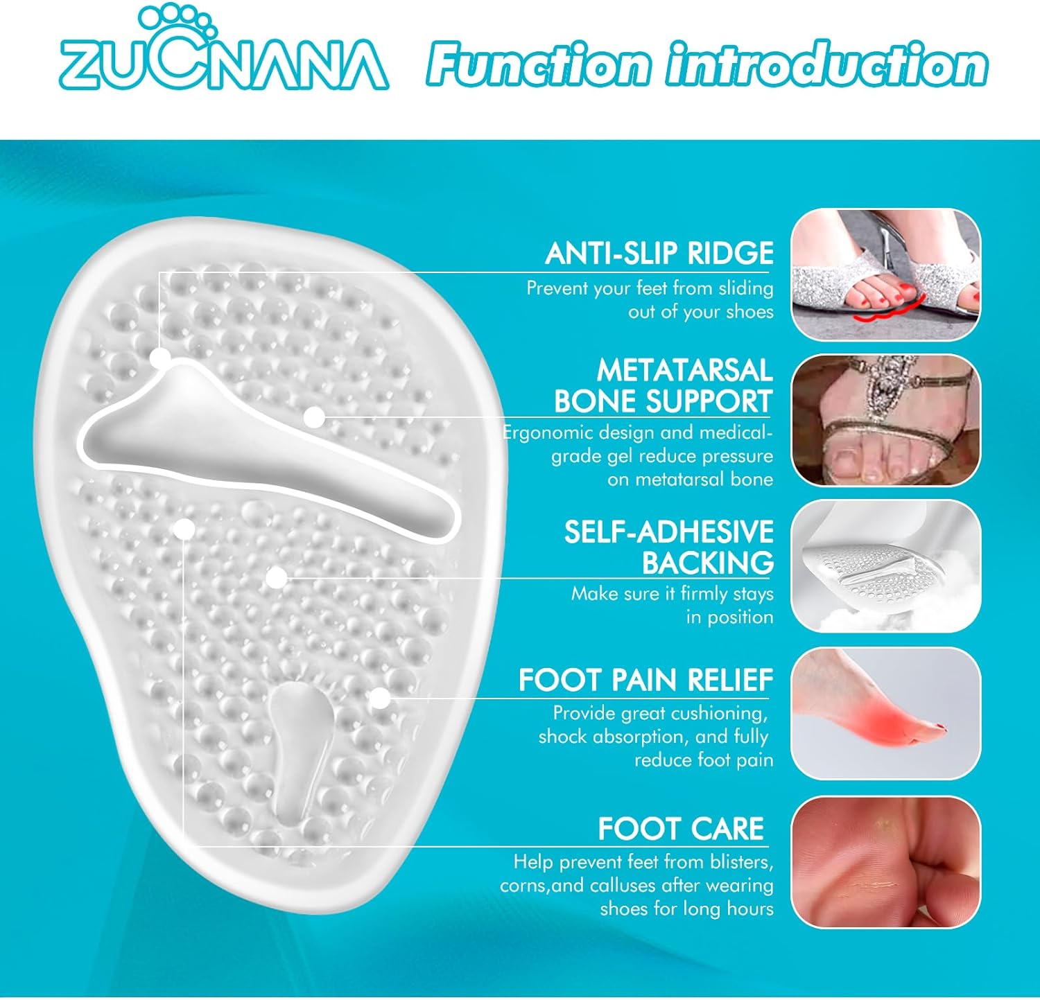 - WEARING SHOES WITHOUT PAIN: ZUCNANA ball-of-foot cushions are made by premium and soft gel. No matter you work, dance, or go shopping in heels, these metatarsal pads provide great cushioning and shock absorption, and help relieve foot pain