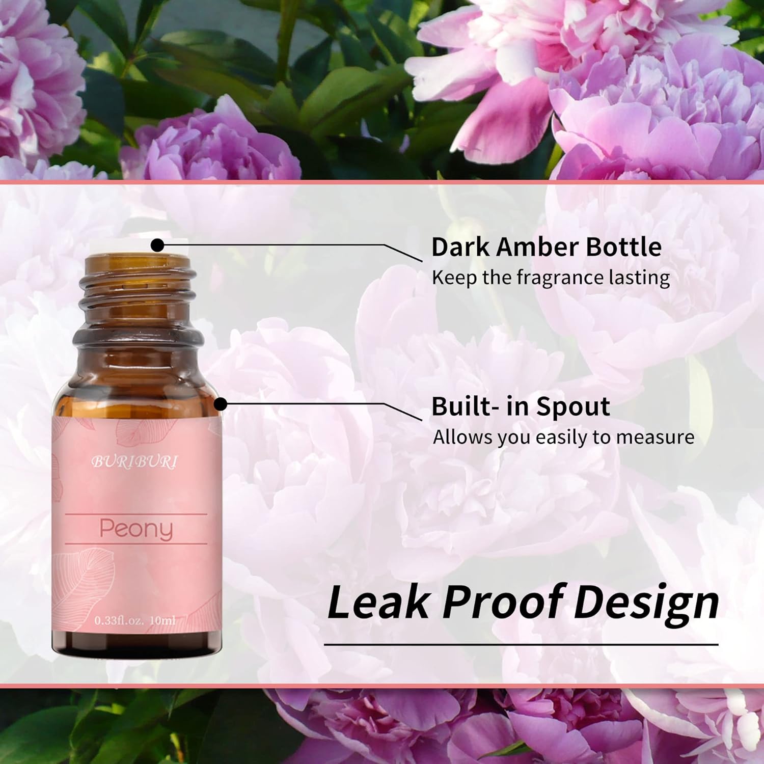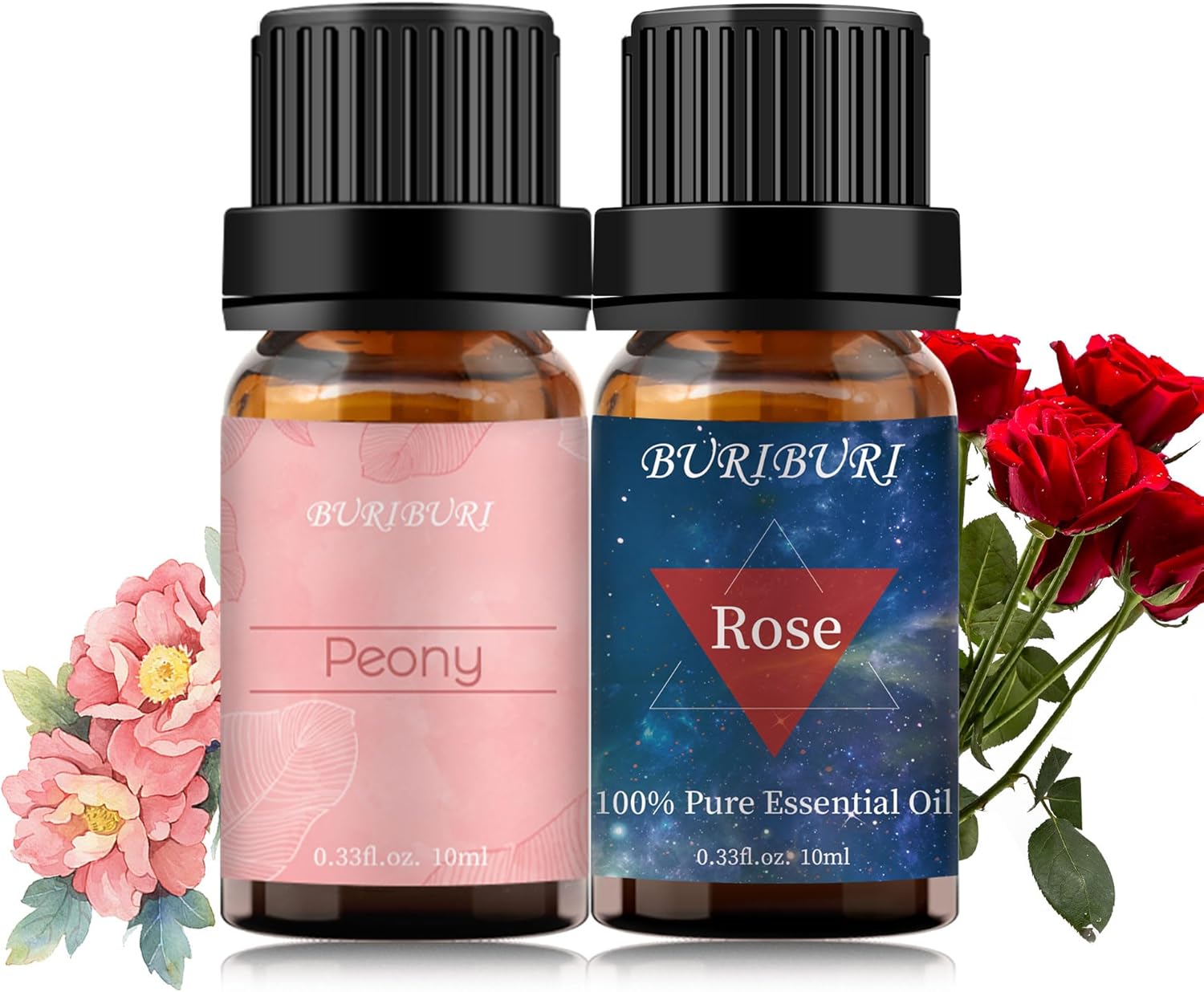 - Packing Includes: 10ml Rose Essential Oil x1, 10ml Peony Essential Oil x1. With no adulterants or dilution, 100% pure quality. BURIBURI scented oil is bottled in a durable amber glass bottle.