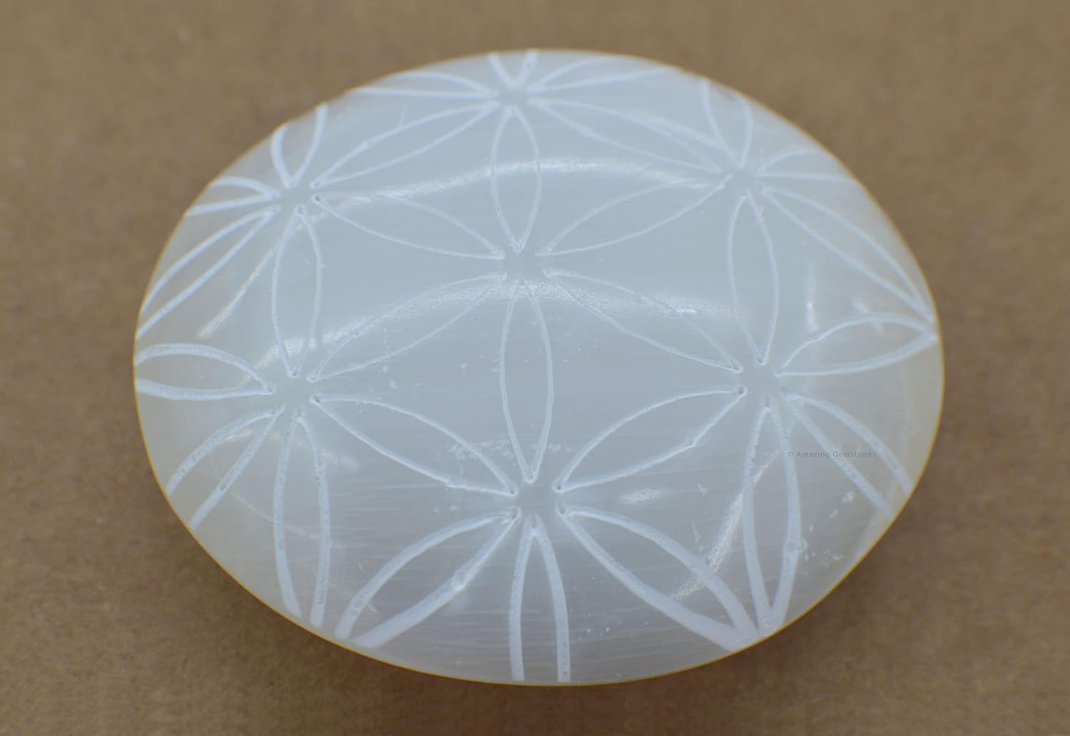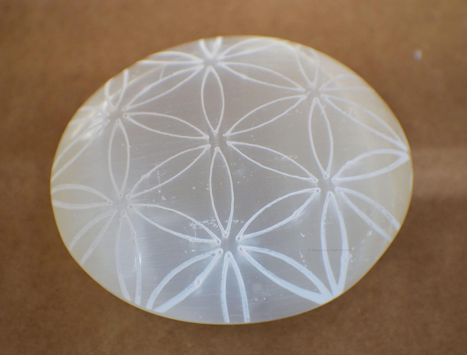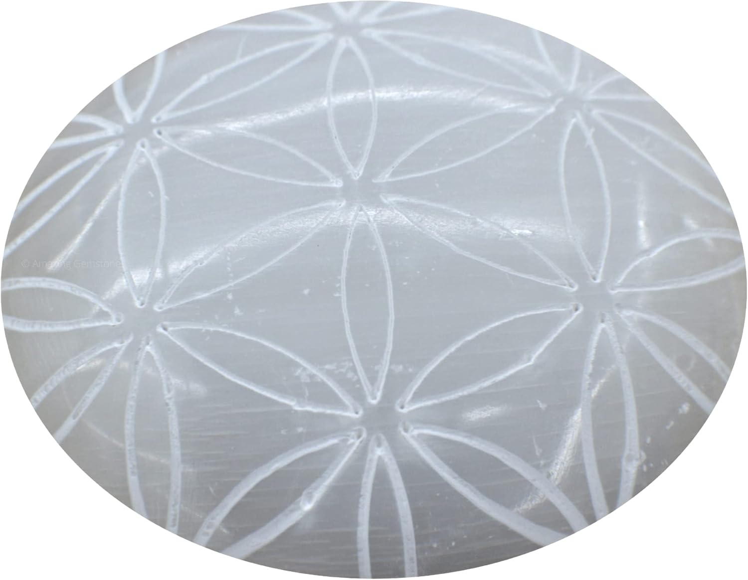 Amazing Gemstone Selenite Palm Stone - Flower of Life Engraved Hot Massage Worry Stone for Natural Body Chakra Balancing, Reiki Healing and Crystal Grid