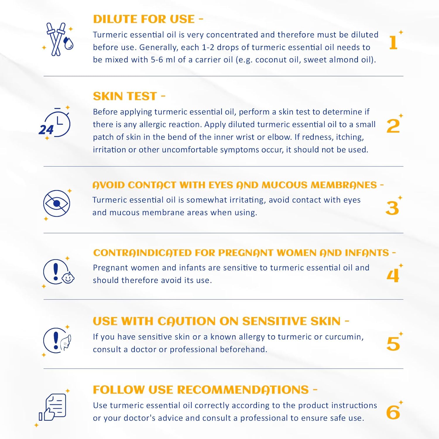 - Multiple Blend: The woodsy scent of turmeric essential oil blends well with Cinnamon, Ginger, Cardamom, Orange, Grapefruit, Ylang Ylang. Dilute with carrier oil before use. Test on feet first for skin sensitivity prior to widespread use