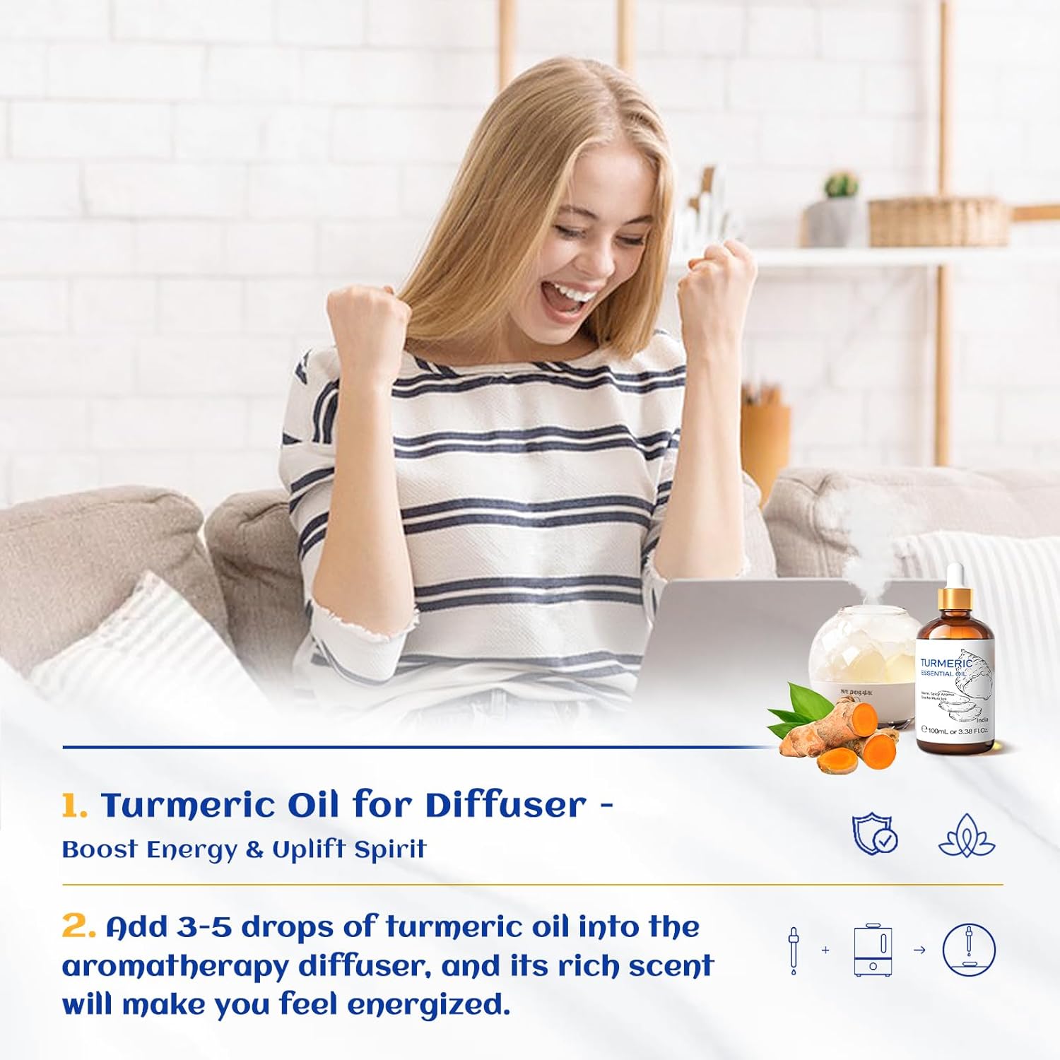 - Multiple Use Scenarios: Add 1-2 drops of turmeric essential oil when washing clothes in the washing machine to deodorant, commonly used in home cleaning, kitchen, shower, bathtub, toilet, sauna, spa, aromatherapy, outdoor space, car, air freshening, office, bedroom, yoga
