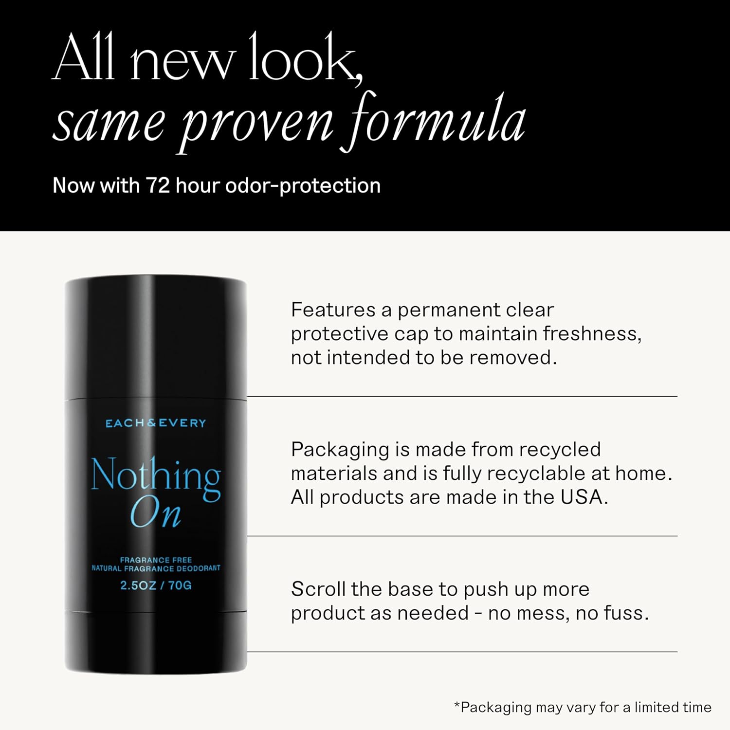 - Nothing On - This release pares it down to our core formula, leaving nothing between us but skin. Plush tapioca starch and conditioning coconut oil also give this sensitive skin deodorant a smooth glide.