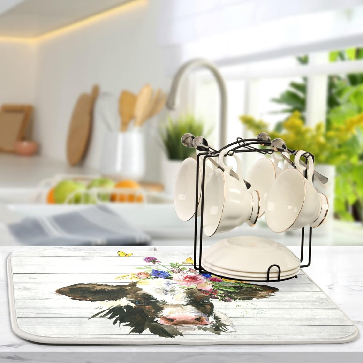 White Farmhouse Cow Wood Dish Drying Mats for Kitchen Drying Mat 16 x 18 Inch Absorbent Microfiber Drying Dish Mat Machine Washable Dish Rack Pad Dish Drainer Mat