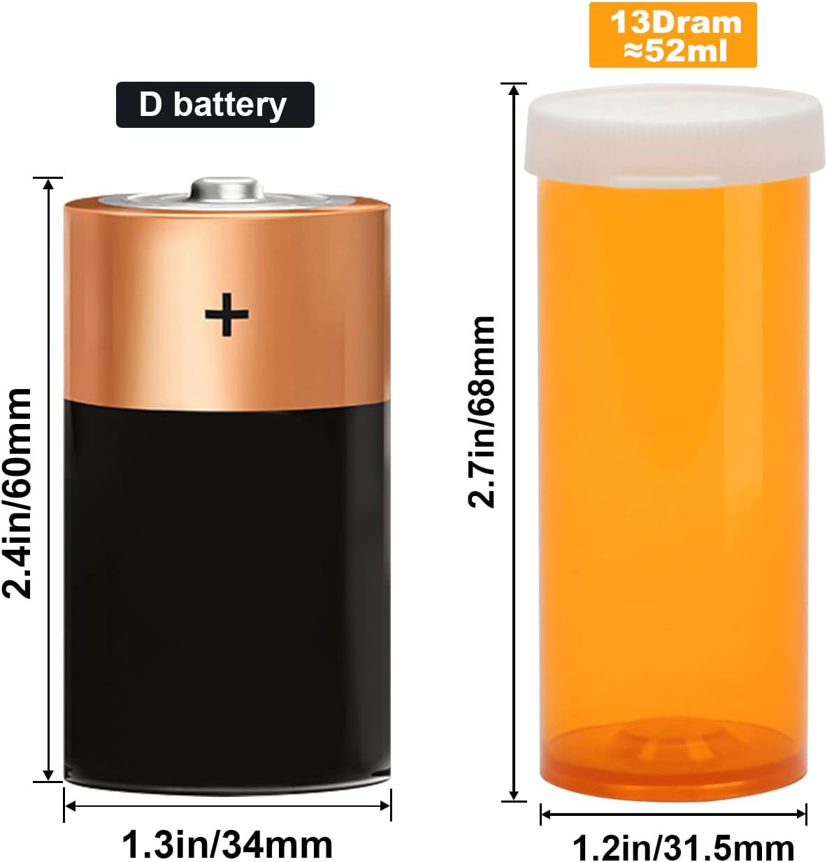 - Perfect Size: Each small plastic prescription vials measures approximately 1.2 x 2.7 inches (31.5 x 68 mm), 13 dram โ 52 ml.