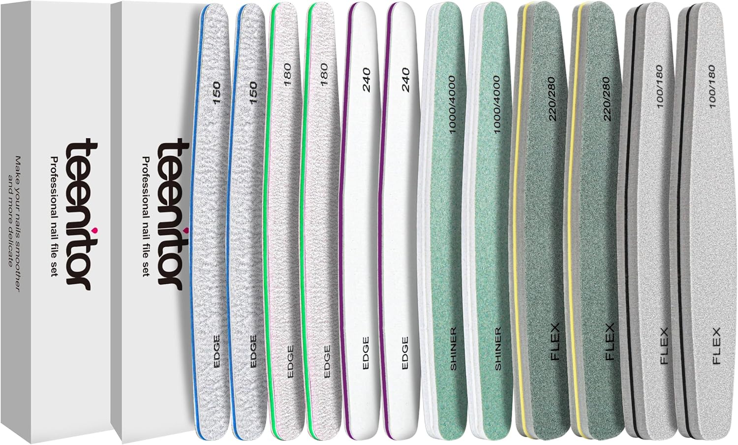 - What A Professional Nail File Set: Teenitor 6pcs Nail File and Buffer Set contains up to 9 different grits files, more choice, more professional. Compare with 4 side buffing block, our nail files set will fine smoothing your nail and provide you excellent salon experience, sturdy and can last for a long time use