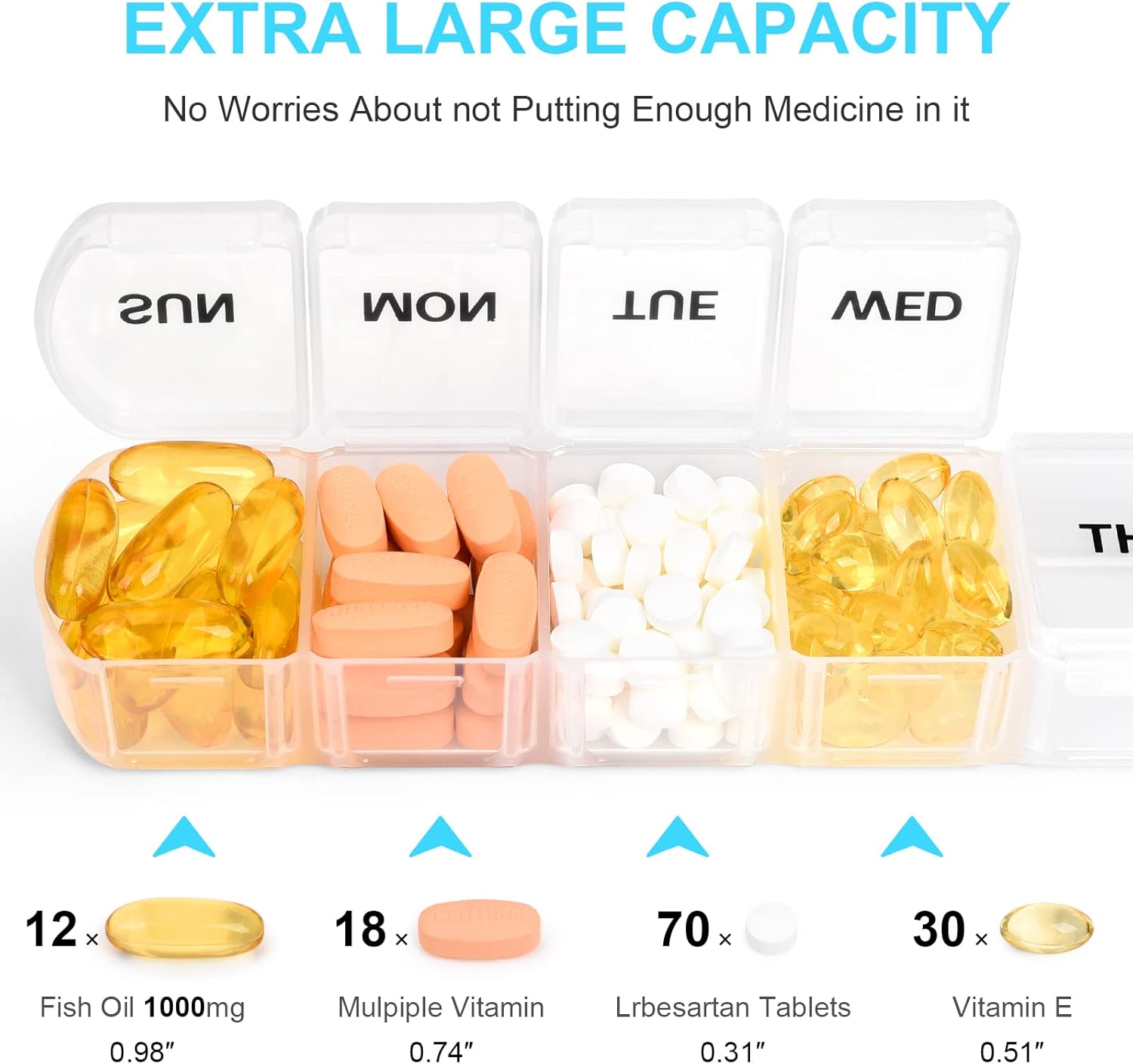 - Portable Size:XL Large Capacity Pill Dispenser, Every daily slot can hold up to 12 large fish oils or 18 vitamins,enough space for filling and sorting all your pills for the entire week, help you to easily plan and distribute your daily doses,Small and portable size, perfect for your travel or on-the-go,Overall size:9.56"x 1.77"x 1.1", Each slot size 1.55" x 1.24" x 0.9".