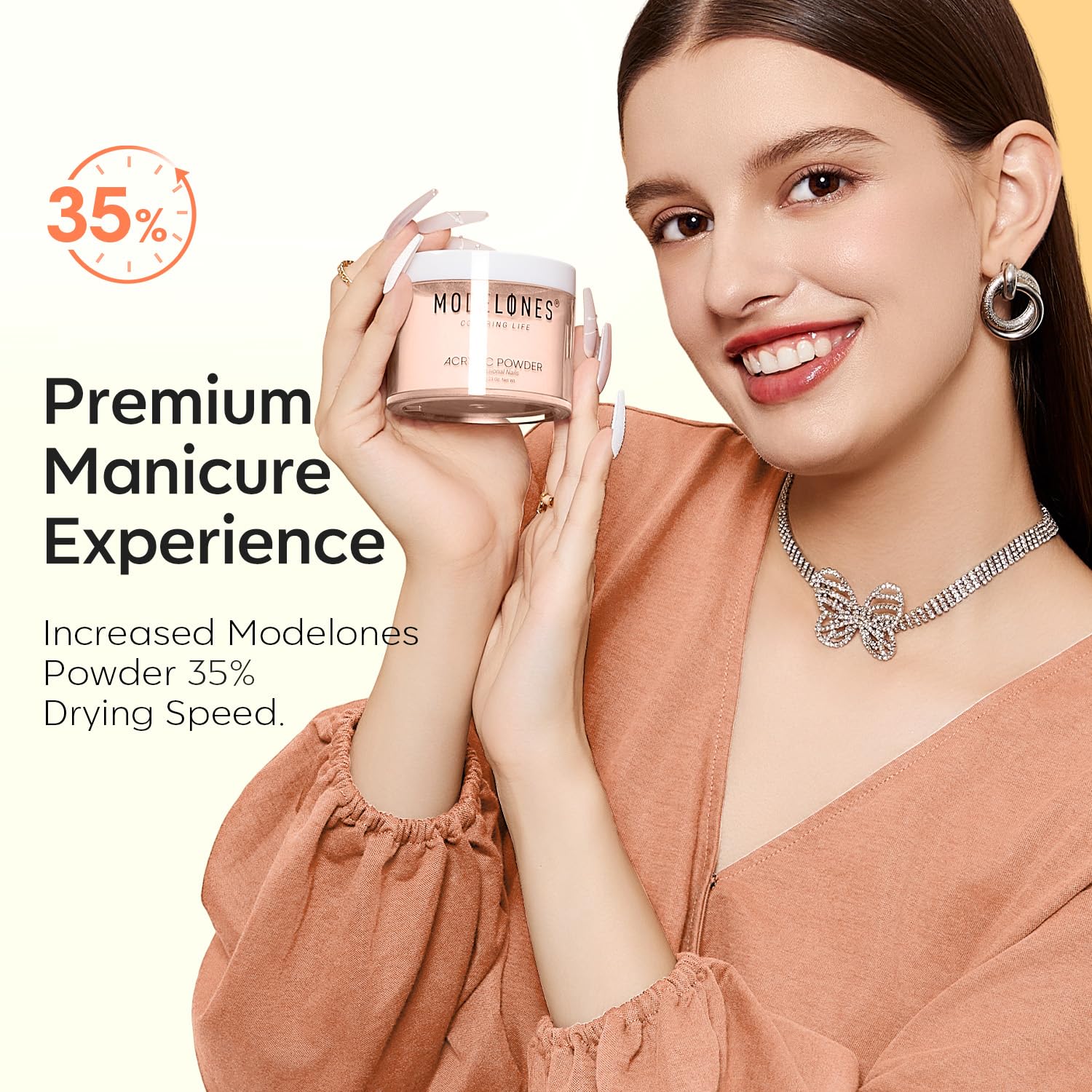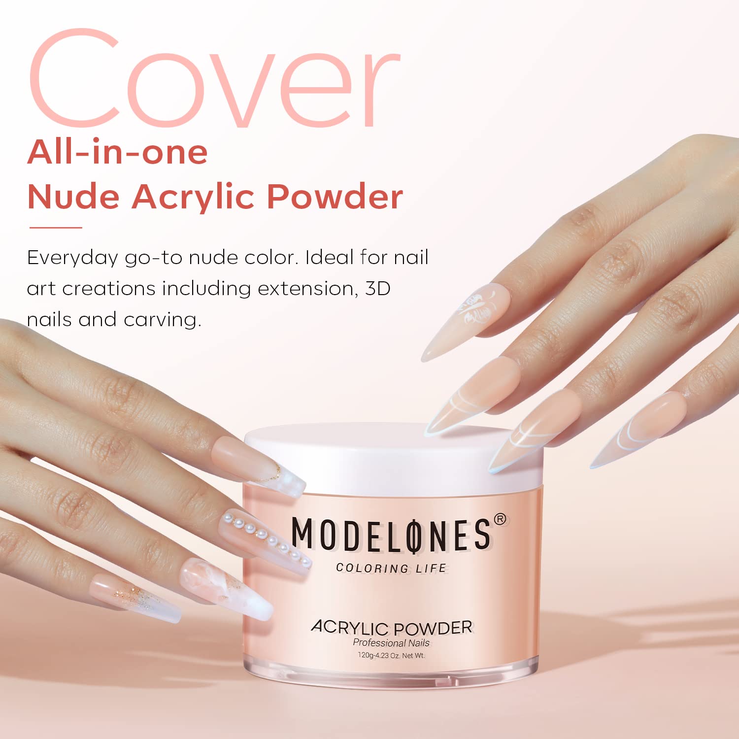 - 【Easy Application & Long Lasting】Modelones acrylic powder system doesn't need a nail lamp to cure, which can avoid damage to the skin from a nail lamp. It is more effective when combined with Modelones acrylic liquid. Long-lasting for 28+ days with perfect shine under proper application - with gel top coat under the full application process.