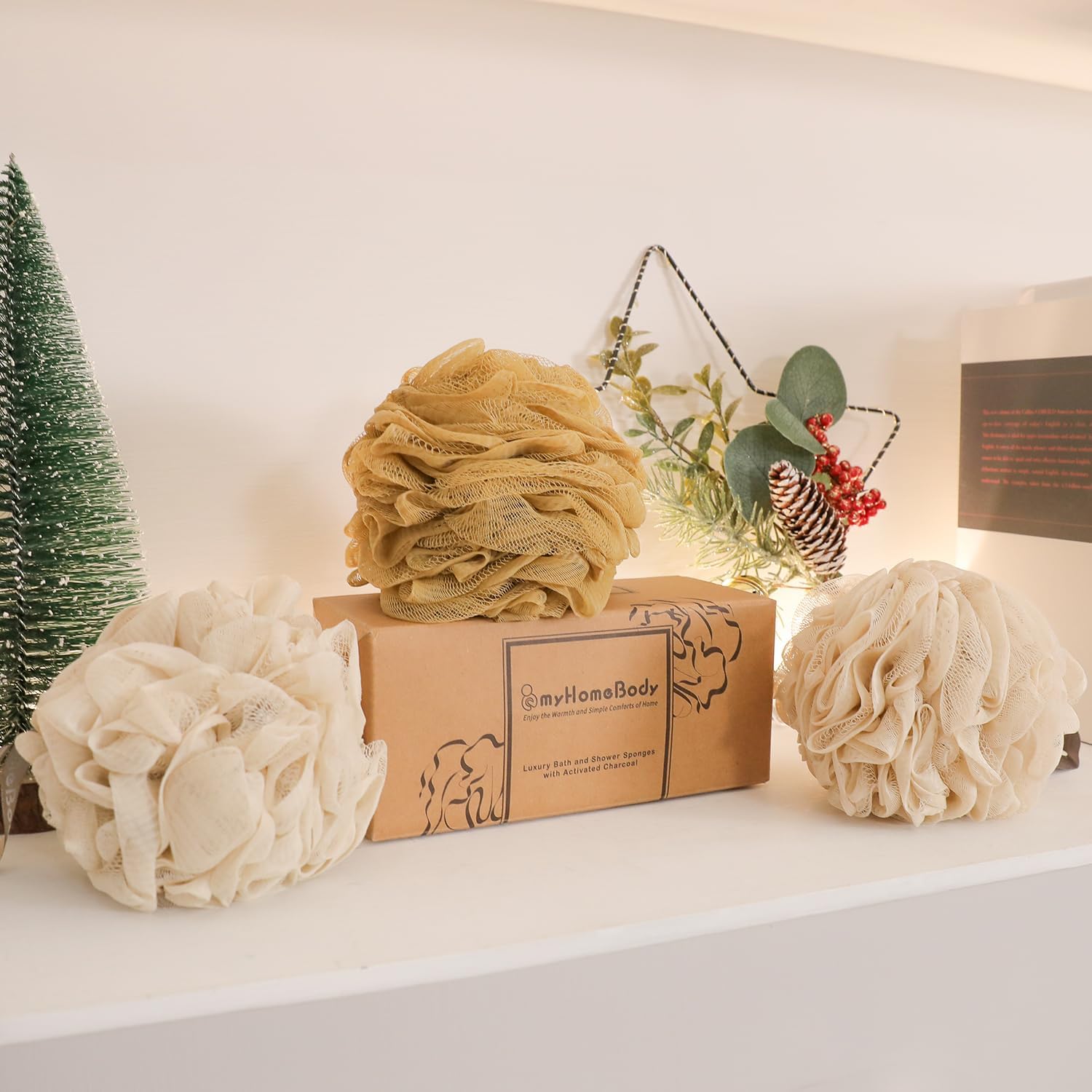 myHomeBody Large 70g Loofah Sponge, Body Scrubber, Bath Sponge, Loofah for Women, Men, Exfoliating Sponge Shower Pouf with Activated Charcoal - 2 Oat Milk + 1 Caramel, 3 Pack