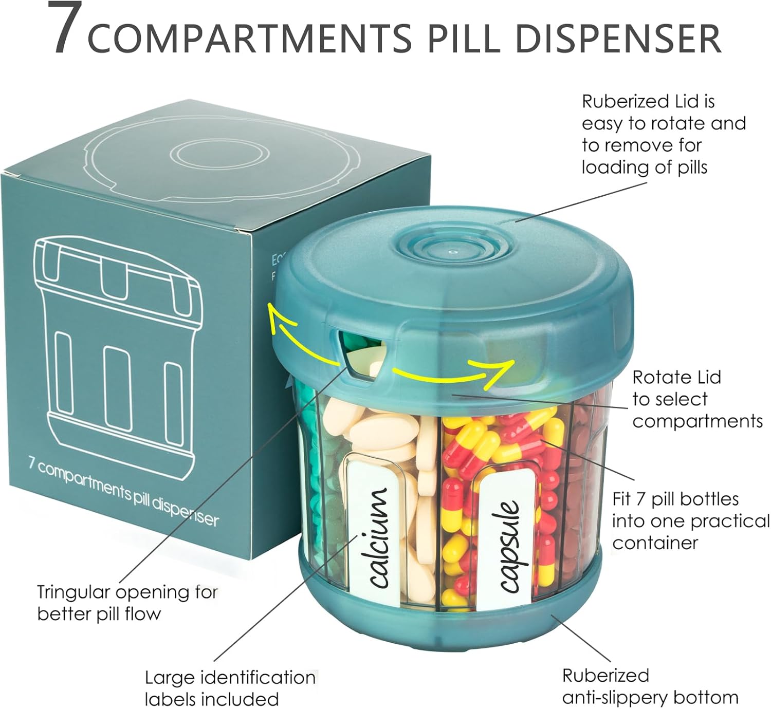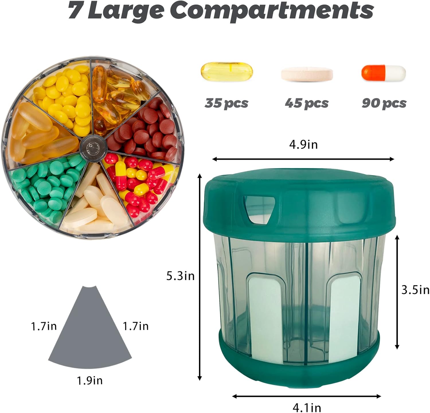 - 【Easy to Use】TPU rubberized lid rotates with ease to select compartments, loading the compartments with vitamin & pills is easy by peeling the flexible lid.