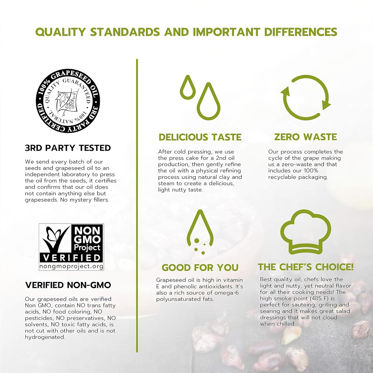 - NON-GMO: Salute Santé! Grapeseed Oil is Cold Pressed, Non-GMO, Kosher and 3rd Party certified 100% grapeseedoil