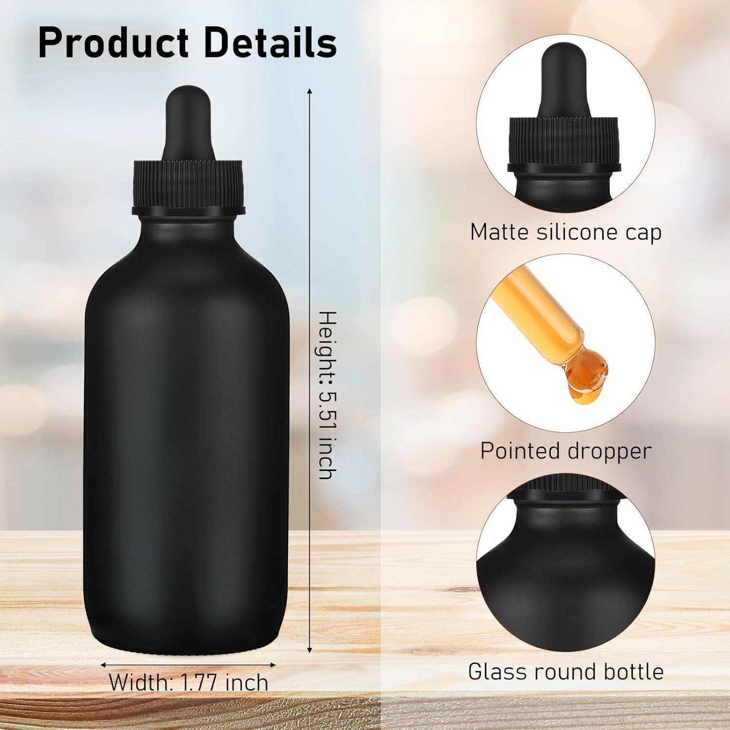 - Quality Dropper Bottles: the 120 ml black glass dropper bottle is made of sturdy and beautiful black glass body, small glass eye dropper, thick black plastic cap and corrosion resistant silicone top, a nice container for storage of oils and others