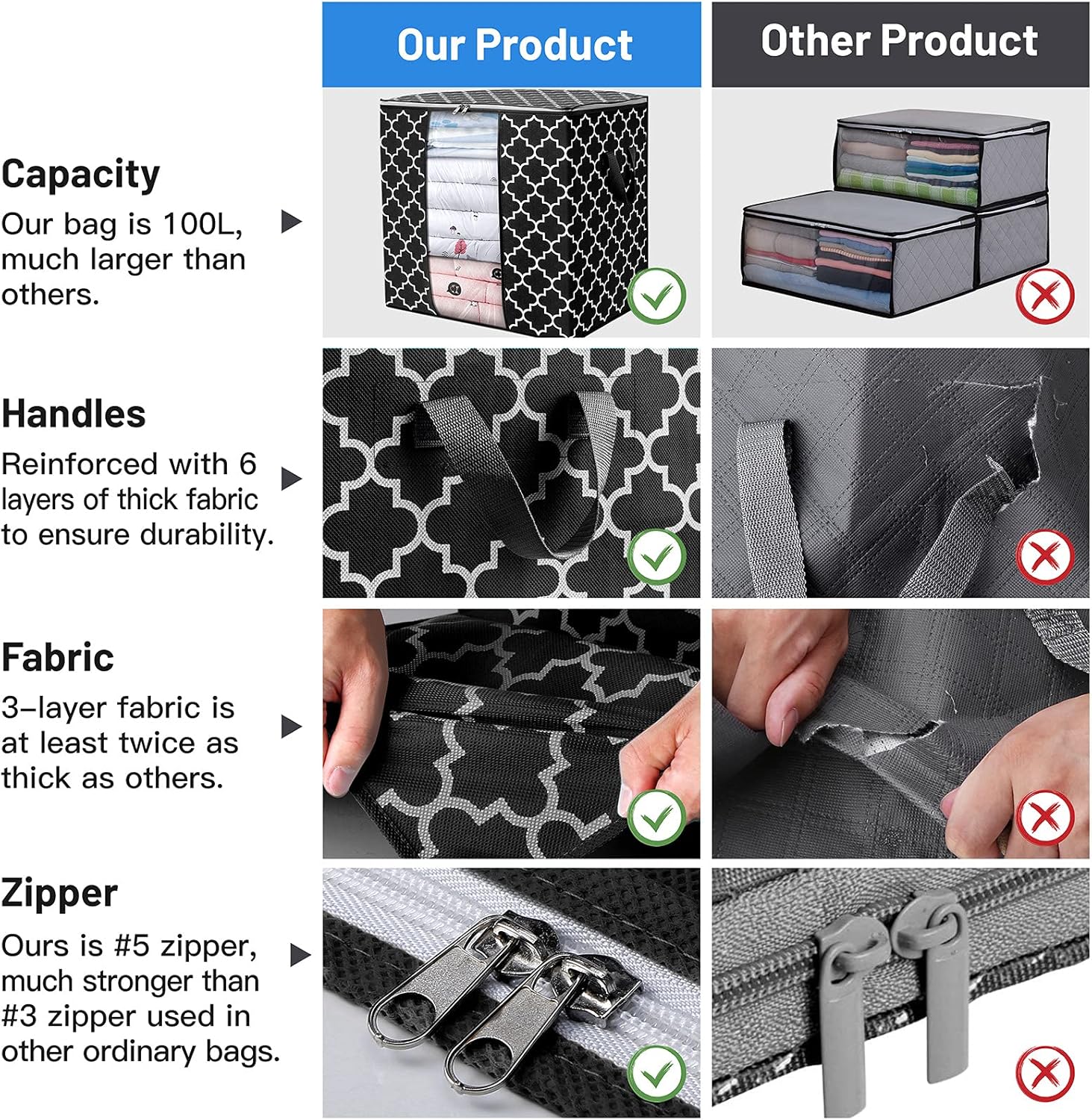 - Large Capacity: Each storage bag measures 20.5βx 20.5β x 14.6β / 52 x 52 x 37 cm , with 100L capacity; The organizer is spacious to store your comforters, pillows, bedding, blankets, plush toys, sweaters, out of season clothing or any other soft items;